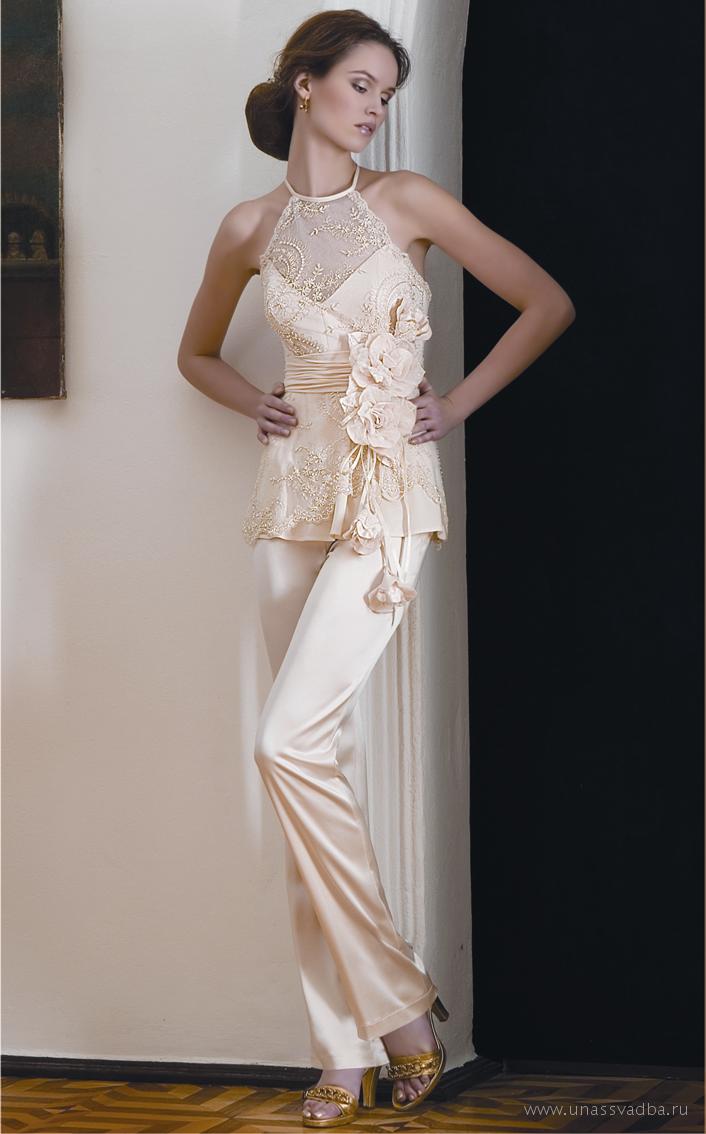 It will look very stylish suit, with what it can be not only with a skirt, but also a trouser. However, brides over thirty are more likely to choose costumes with a skirt. It can be decorated with rhinestones or embroidery.