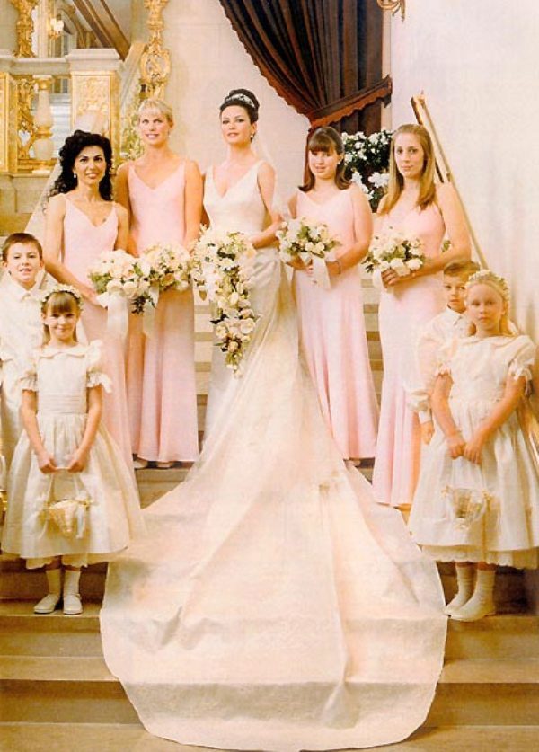 The most beautiful Hollywood star couple is Michael Douglas and Catherine Zeta-Jones. Although the bride's dress was strict, it was not inferior in its chic, as well as the price, which was within 140 thousand dollars.
