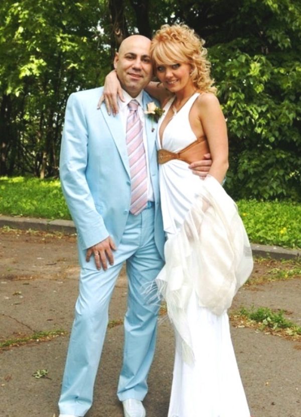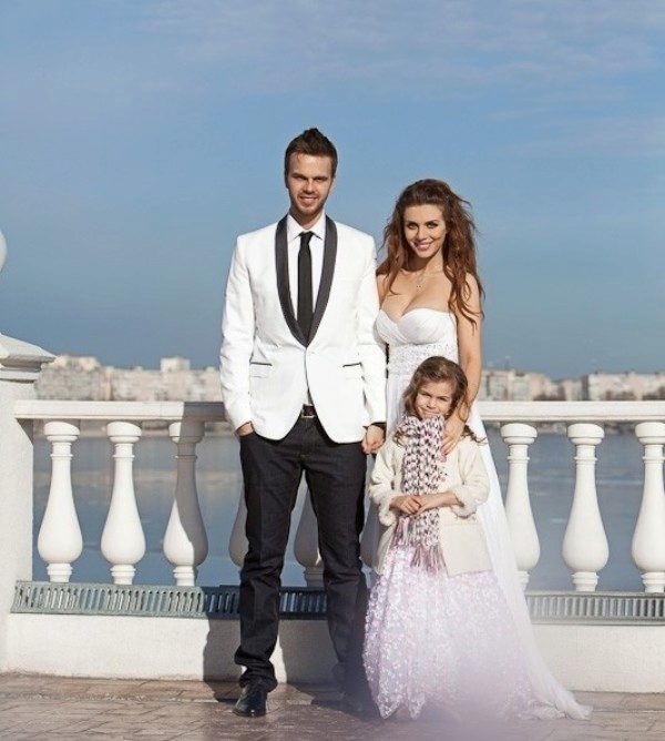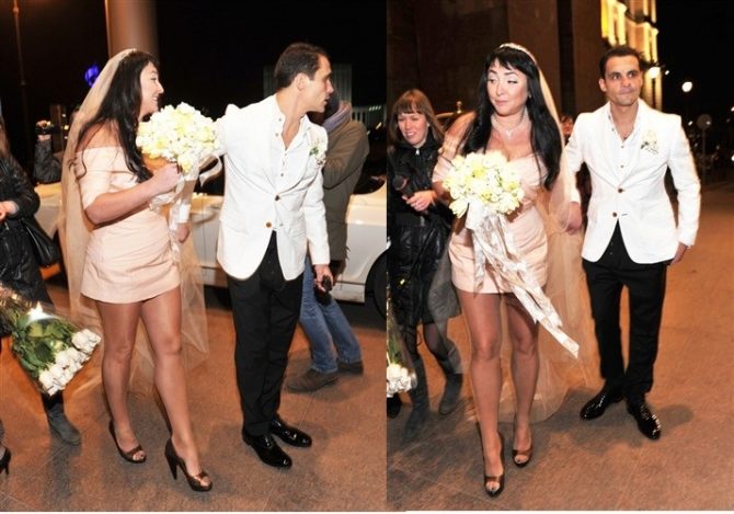 Previously, Anna was completely different: a modest, sweet girl, with whom in no way combined such qualities as bitchiness, shocking and glamor. Her dress was designed accordingly, so the bride was beautiful. Veil with embroidery, long dress in classic white color, with seductive open shoulders. The waist was distinguished by an insert of guipure, richly decorated with shiny elements.