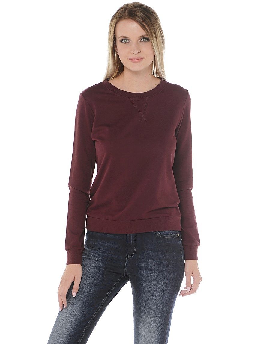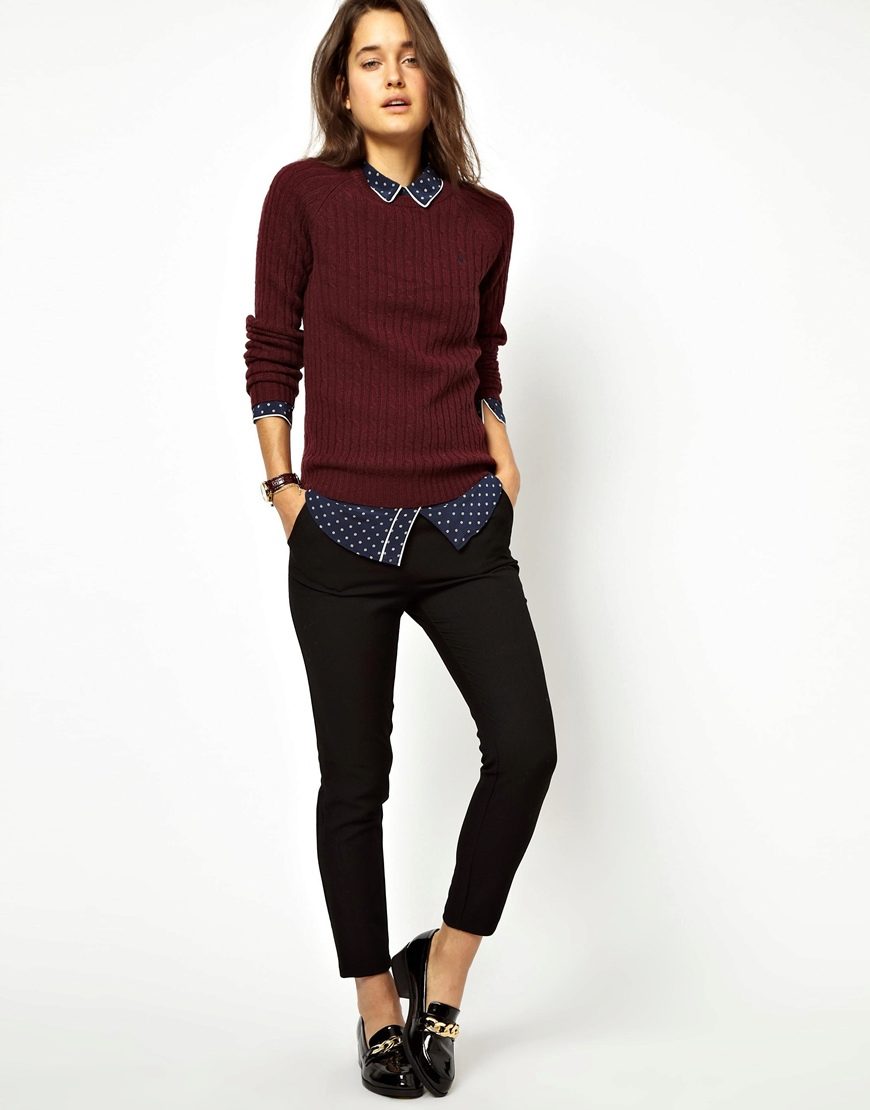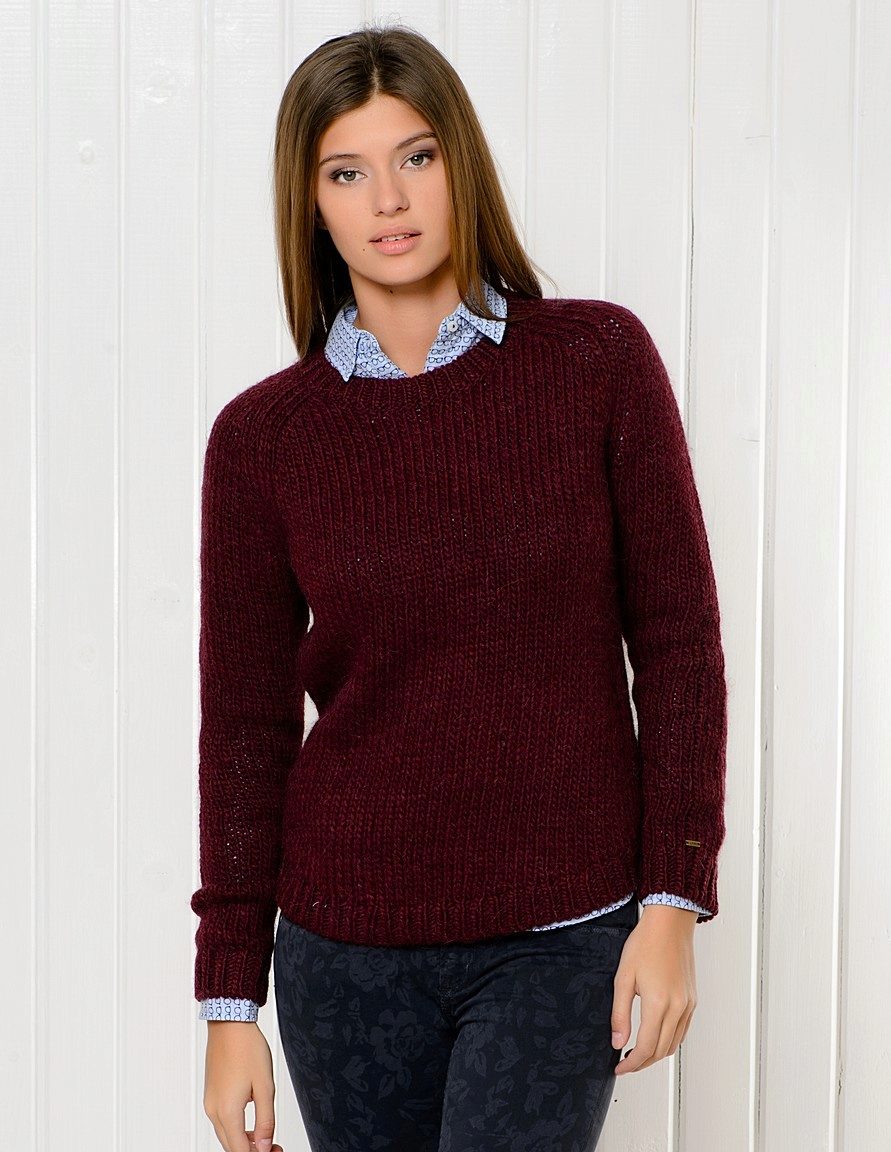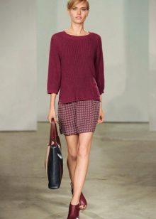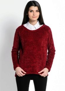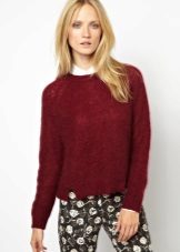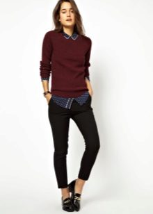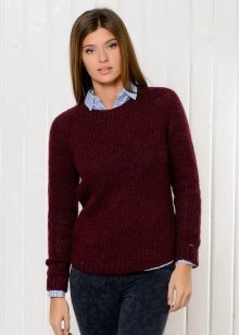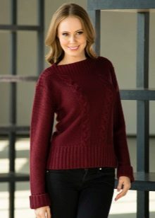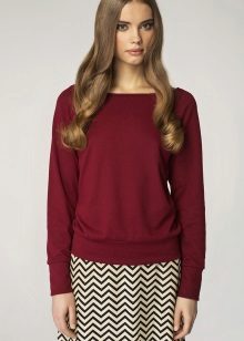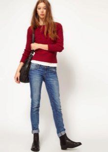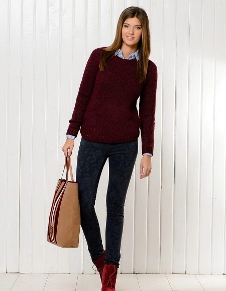 And, of course, a burgundy sweater will look great against the background of blue jeans of any cut. They can add a blue shirt of classic style and a great set for work, study or a walk is ready!