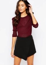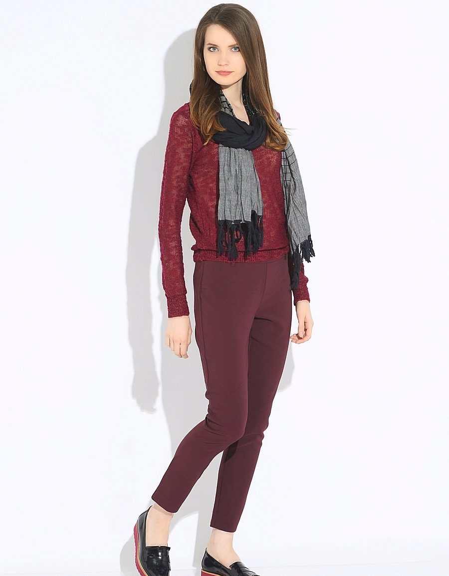 One of the most successful combinations: burgundy + black. Classic look: burgundy sweater and black pants or skirt. A win-win for office or daily life.