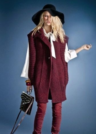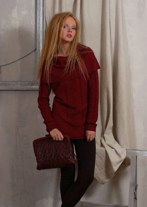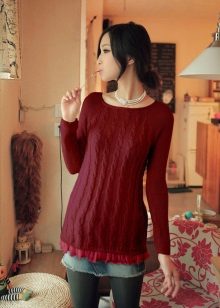To create a solemn, evening dress perfect fit model of long burgundy sweater, reminiscent of a tunic. Such a sweater can be worn as a dress, complementing the outfit with thick dark tights and high boots or ankle boots with heels. Or you can wear tight black pants to a sweater. A beautiful wide belt that will effectively emphasize the waistline will complement the set.