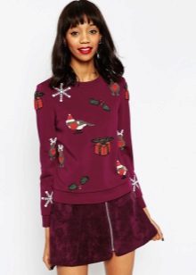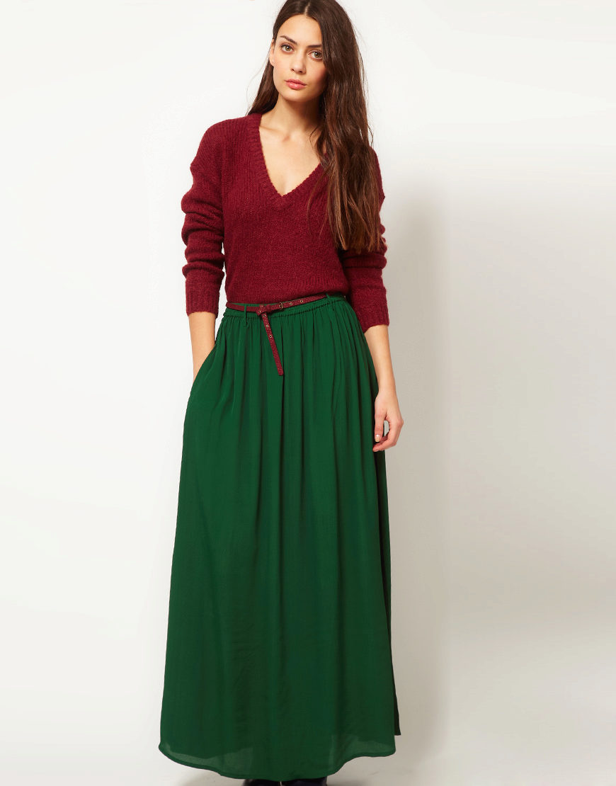 An interesting option for a solemn occasion will be a beautiful burgundy sweater and a long dark green flared skirt.