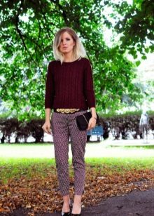 To emphasize the beauty of the chosen model of the sweater, its interesting pattern and deep color will help clothes of neutral light beige or steel color.