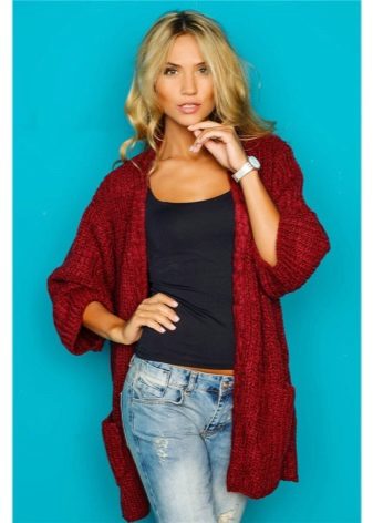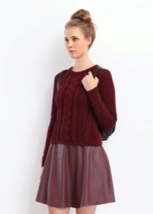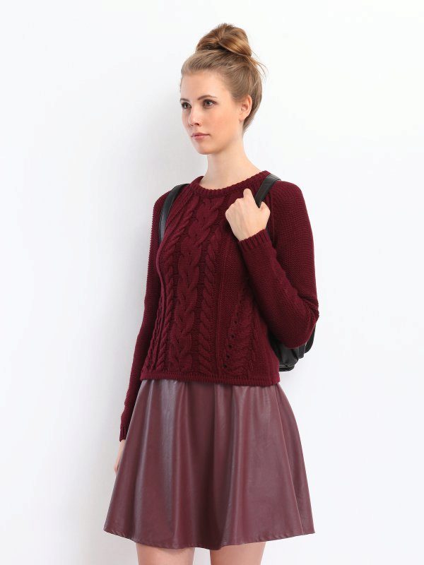 A voluminous, wide, fluffy or wooly maroon sweater will be a great addition to black leggings or leggings. If you add to them a stylish pair of shoes with a flat sole and a bright accessory, you get a very modern youth set.