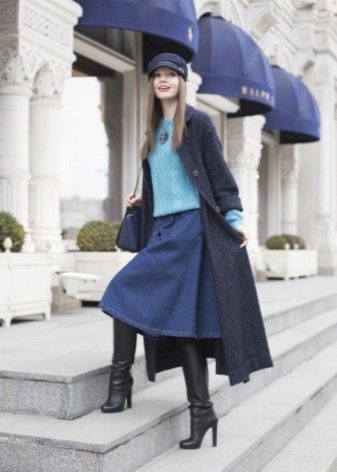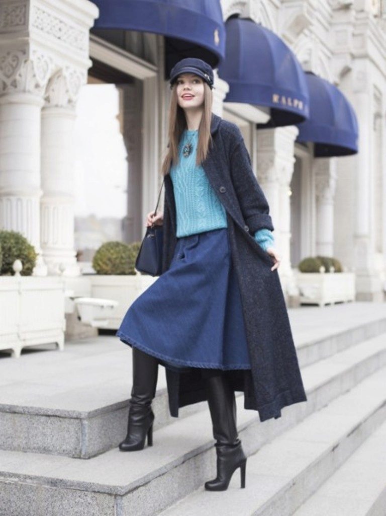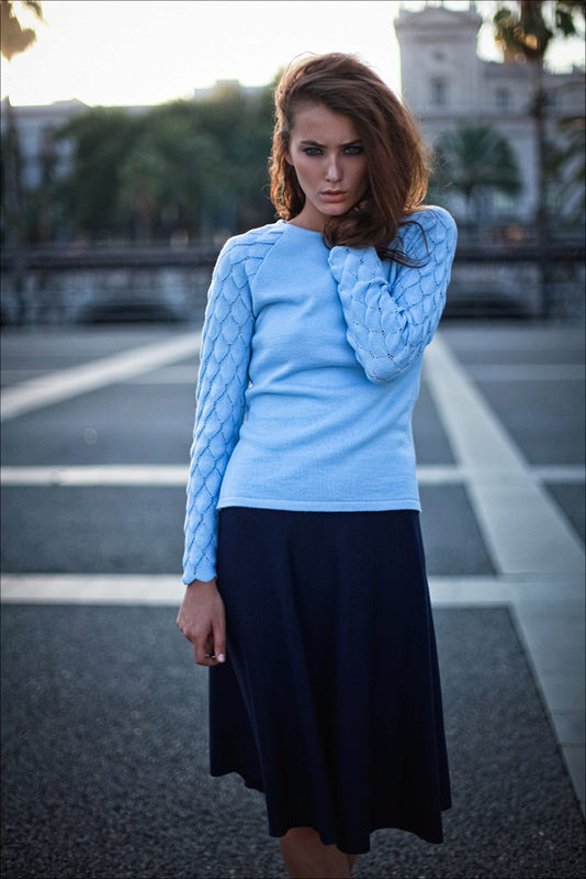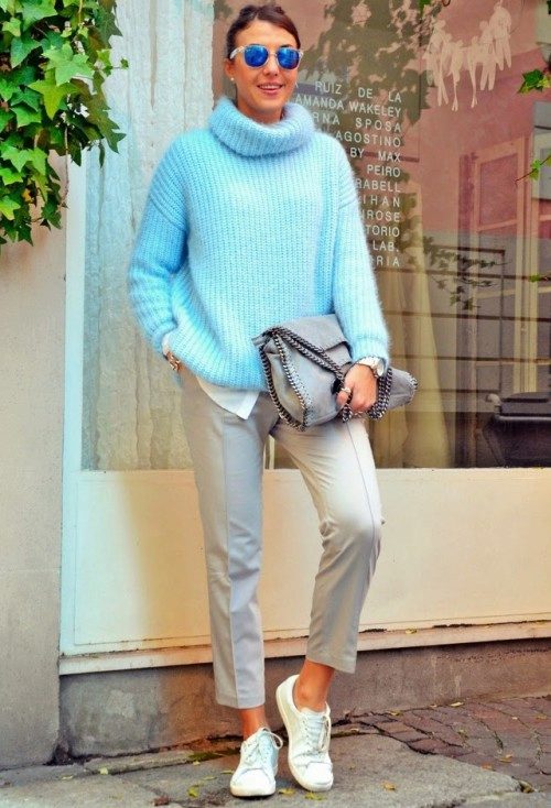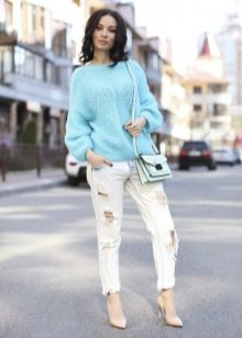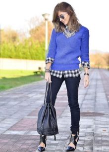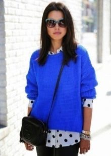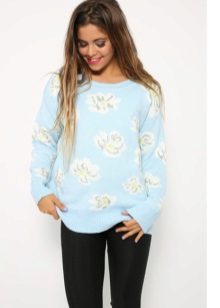Blue sweater sets up a playful mood. For informal models in which you can stroll or meet with friends, designers use laid-back and original drawings.