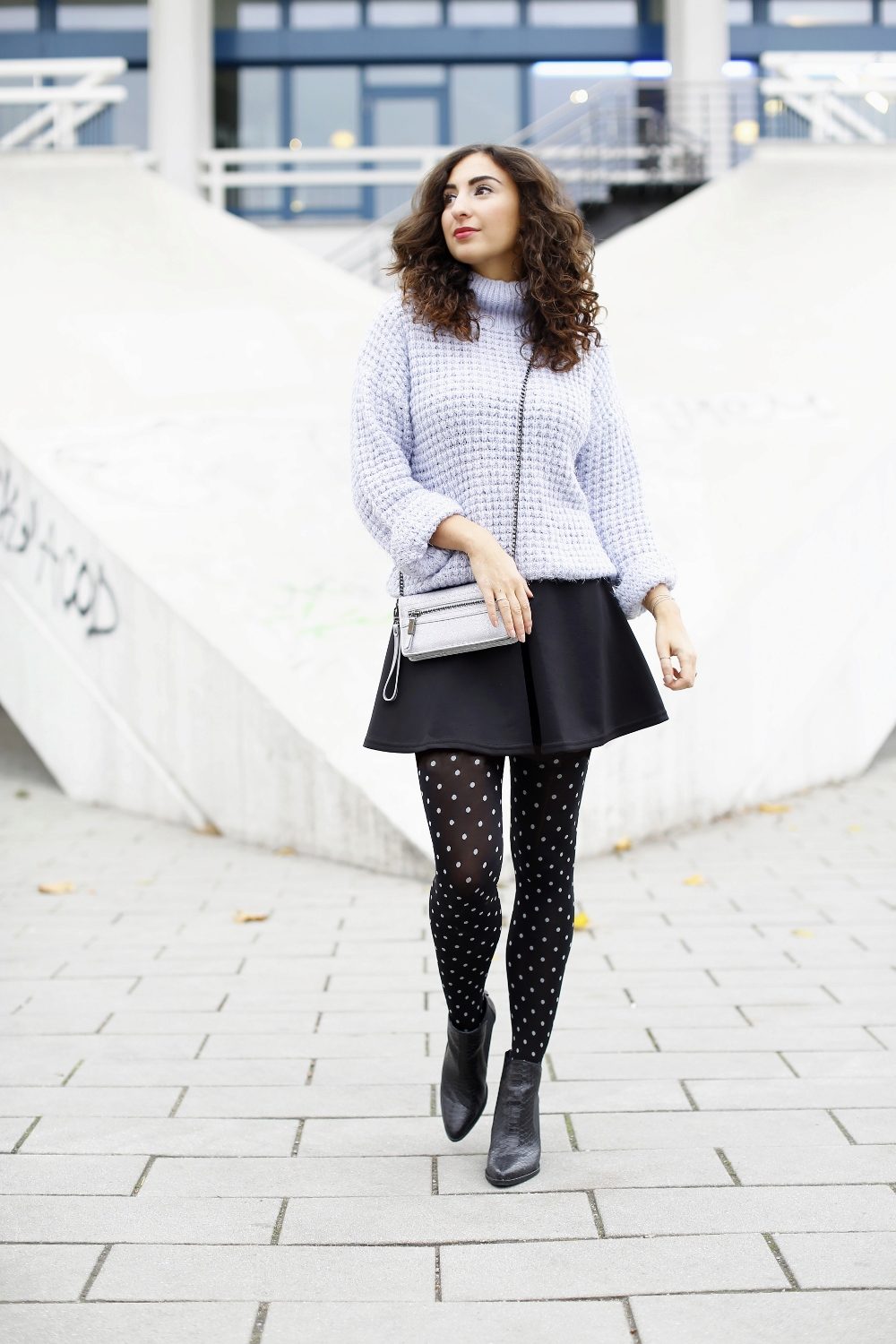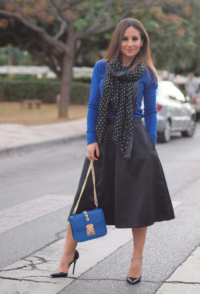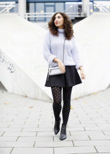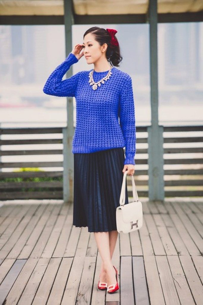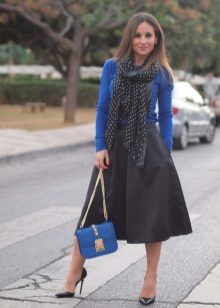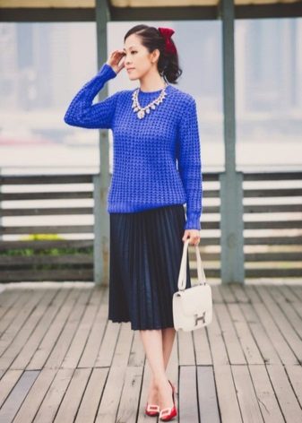 To create a bow that will always be the center of attention, it is enough to add a bright scarlet bottom to the blue sweater.