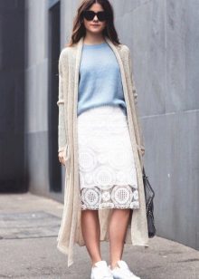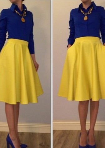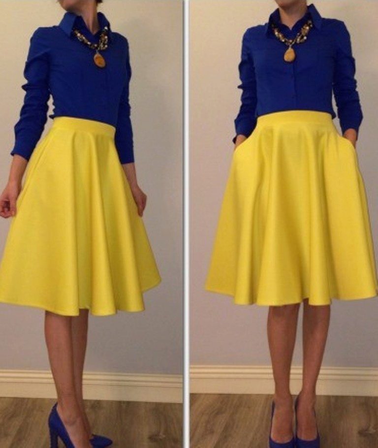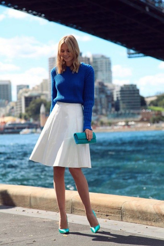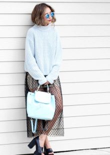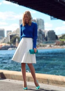 A blue sweater creates an office-business style with white, black and dark gray trousers and skirts. These are classic combinations that fit the requirements of the dress code, strict and elegant.