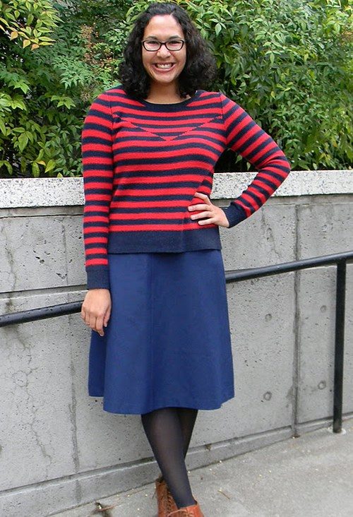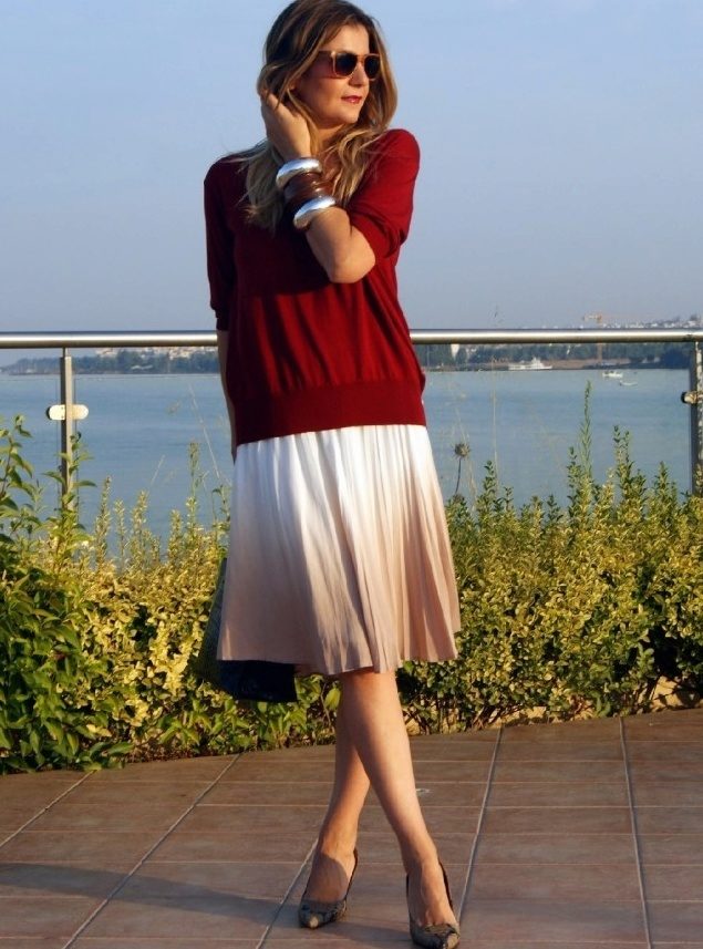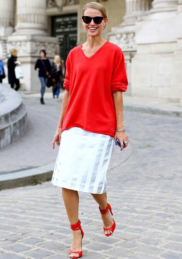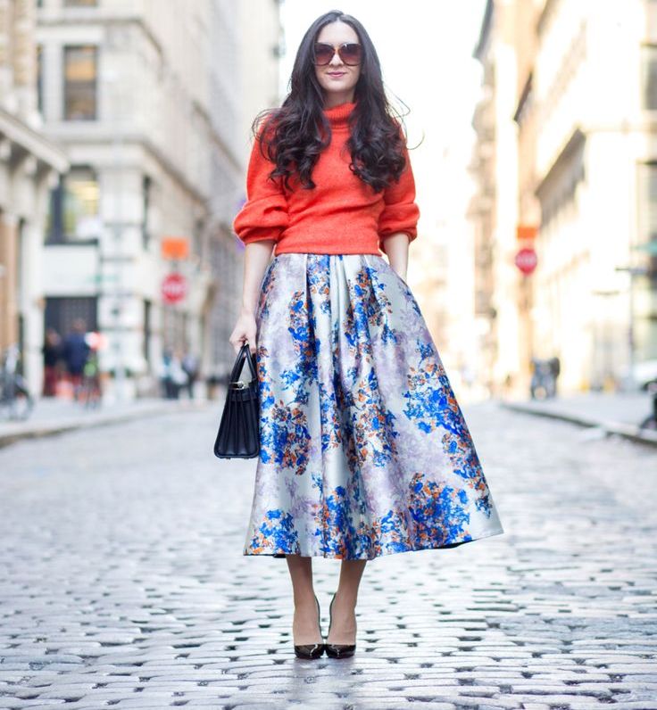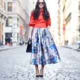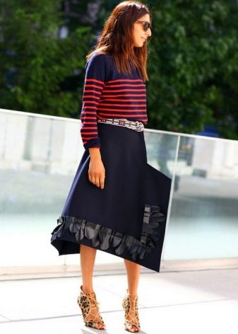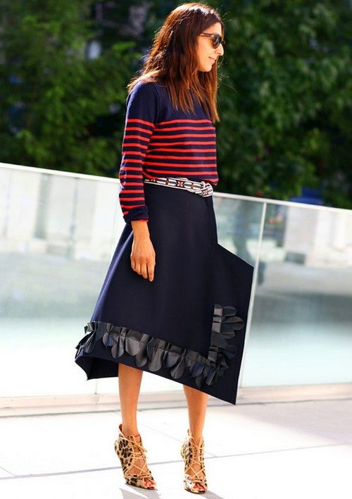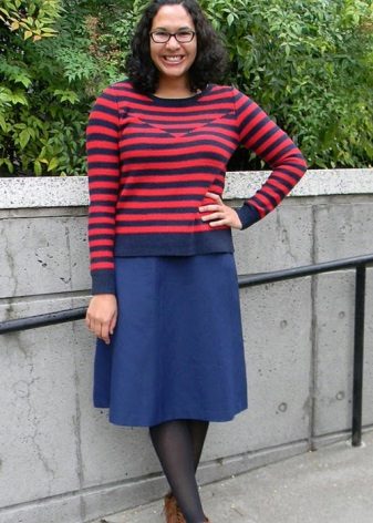 Another stylish print is a red sweater with blue stripes. This model is in perfect harmony with the blue flared skirt length slightly below the knee. In this outfit you will look feminine and romantic.