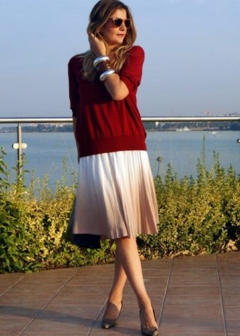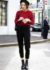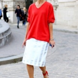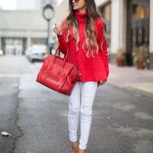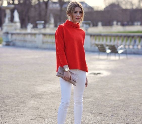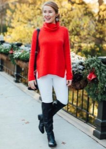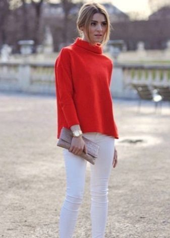 The combination of a red sweater with white trousers or a skirt looks feminine and tender. To create a harmonious image, you should wear shoes to match the sweater. These can be ballet flats or high-heeled shoes.