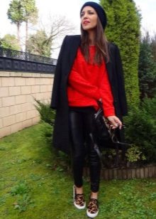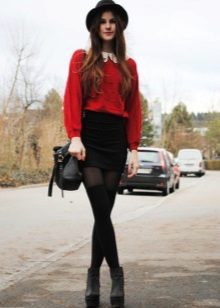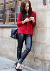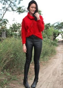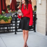 The combination of red and black is always in fashion. You should look at leather trousers or skirts with a glossy sheen. But remember that all accessories should be presented only in these colors.