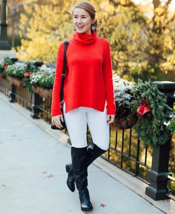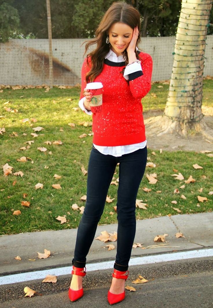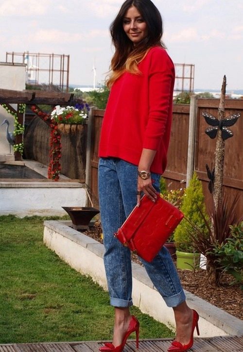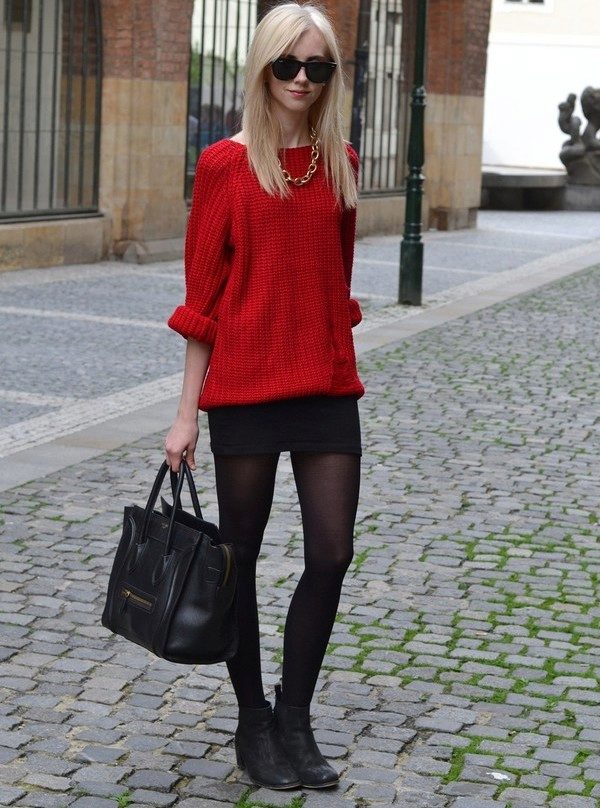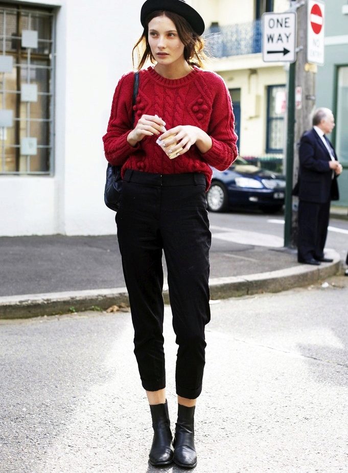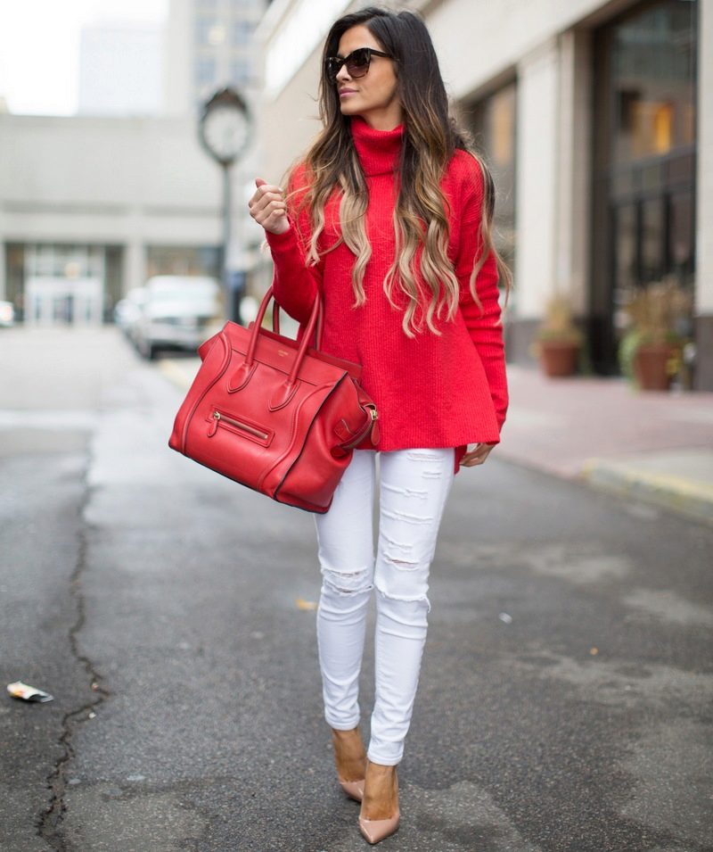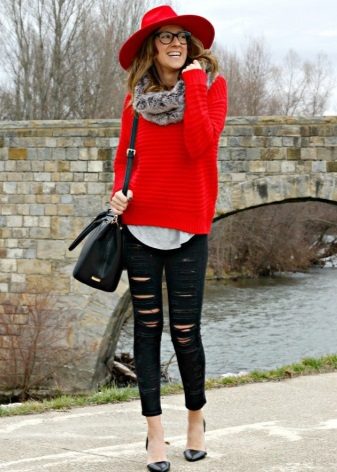 A red sweater is always a bright accent of any image, so to create a harmonious bow it should be combined with things in soothing colors.