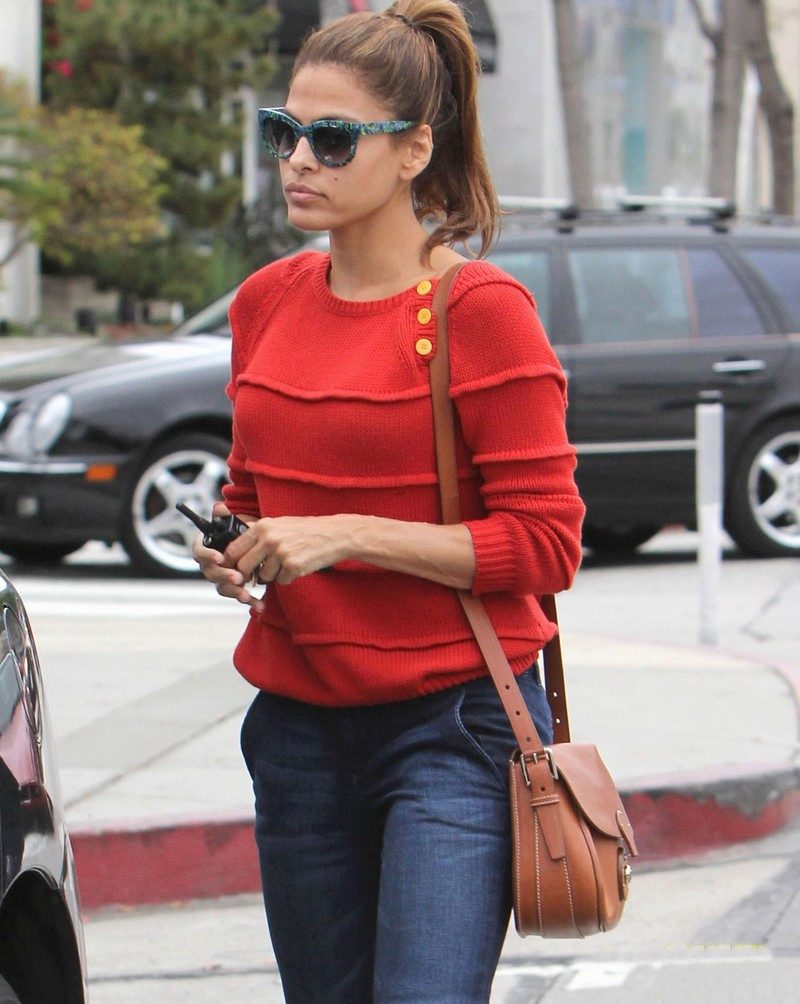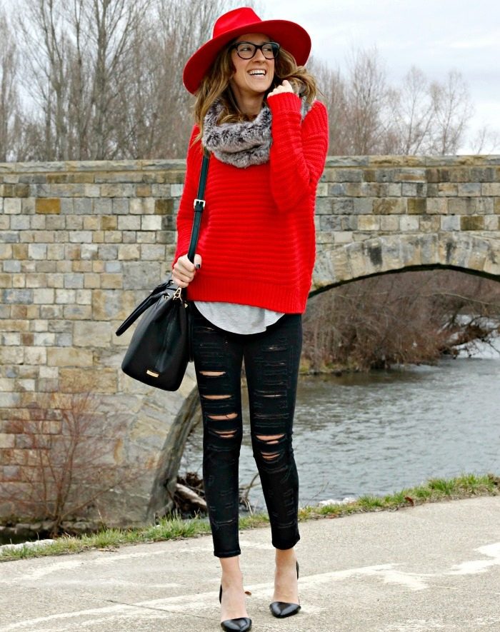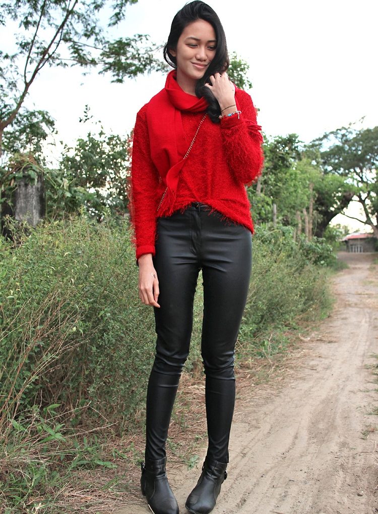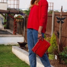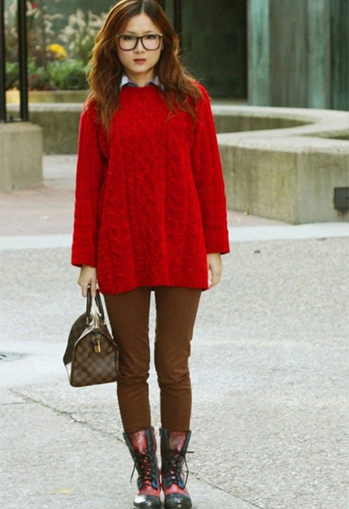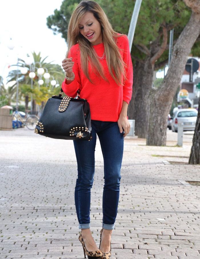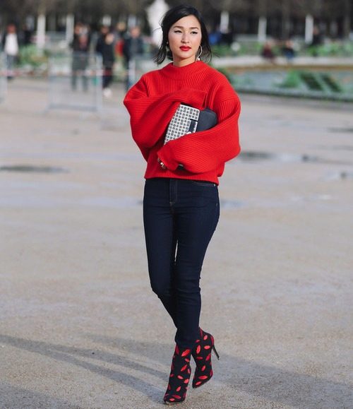 A red sweater is always a bright accent of any image, so to create a harmonious bow it should be combined with things in soothing colors.