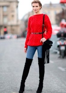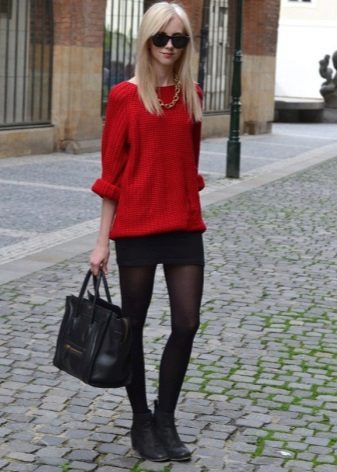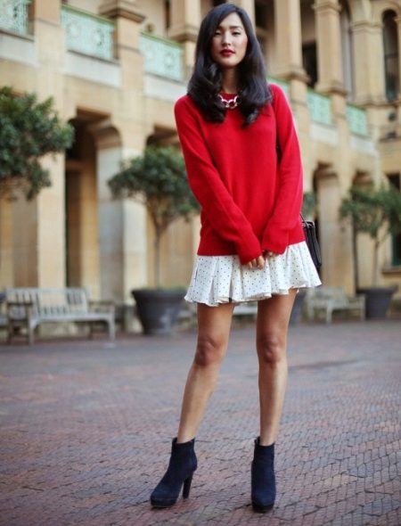 Interesting and stylish looks red sweater in tandem with a sundress. To emphasize the waistline, it is enough to put on an elegant red belt. The perfect complement will be a handbag and shoes to match the sweater.