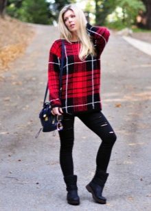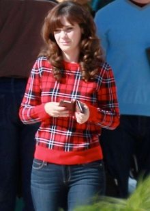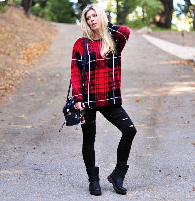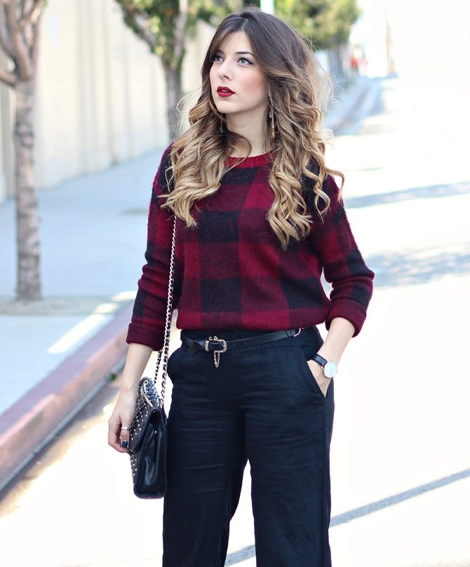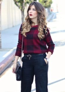 A red checkered sweater is a great choice for a casual style. Usually with red is blue or black. When choosing a bottom, you can give preference to trousers or jeans in black or blue.