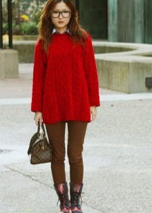 Volume knitted models should be combined with midi length skirts with a straight or flared cut. Also, a good tandem is a voluminous sweater in red with a leather or denim skirt with a short cut. It is worth paying attention to the pants in the classic colors.