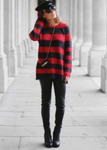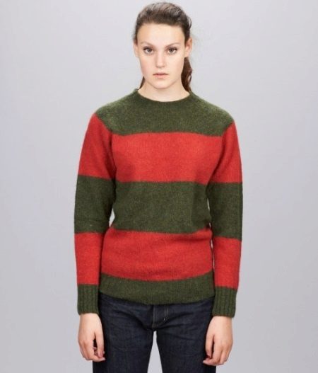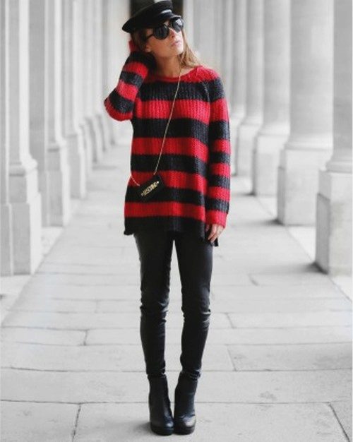 A red and green striped sweater looks harmoniously in an ensemble with slim blue skinny jeans. In this outfit you will surely attract the enthusiastic glances of others. Often, red striped models are worn over a flowing summer dress made of flowing fabric in cool evenings.