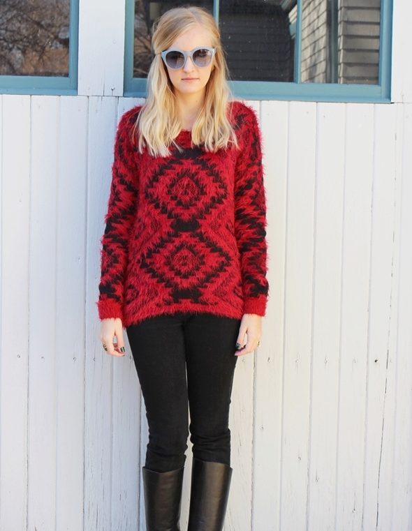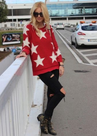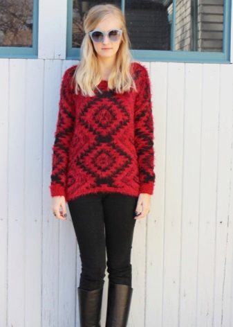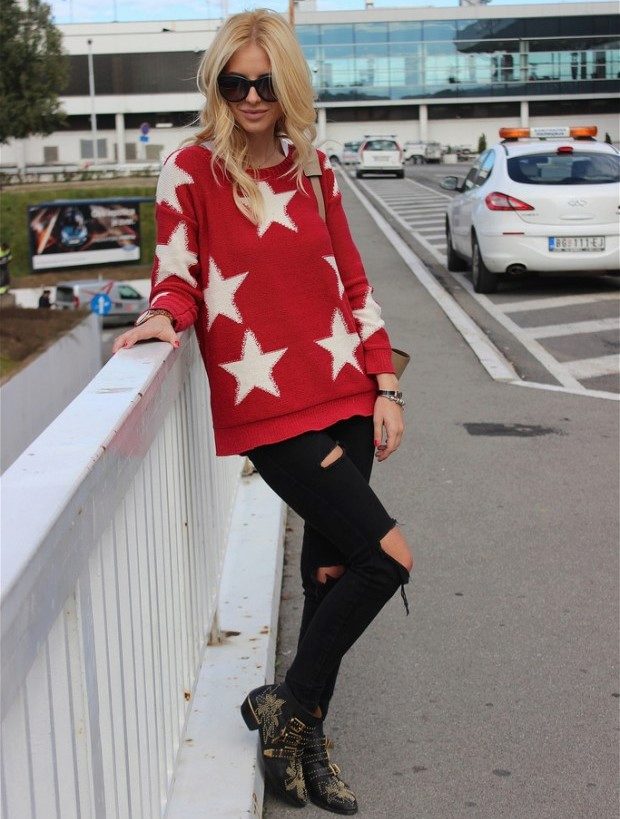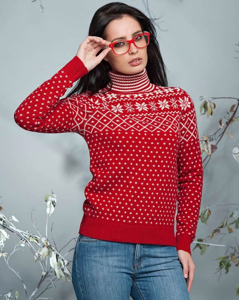 Red sweaters decorated with prints deserve special attention. They allow you to show individuality, add originality and singularity.