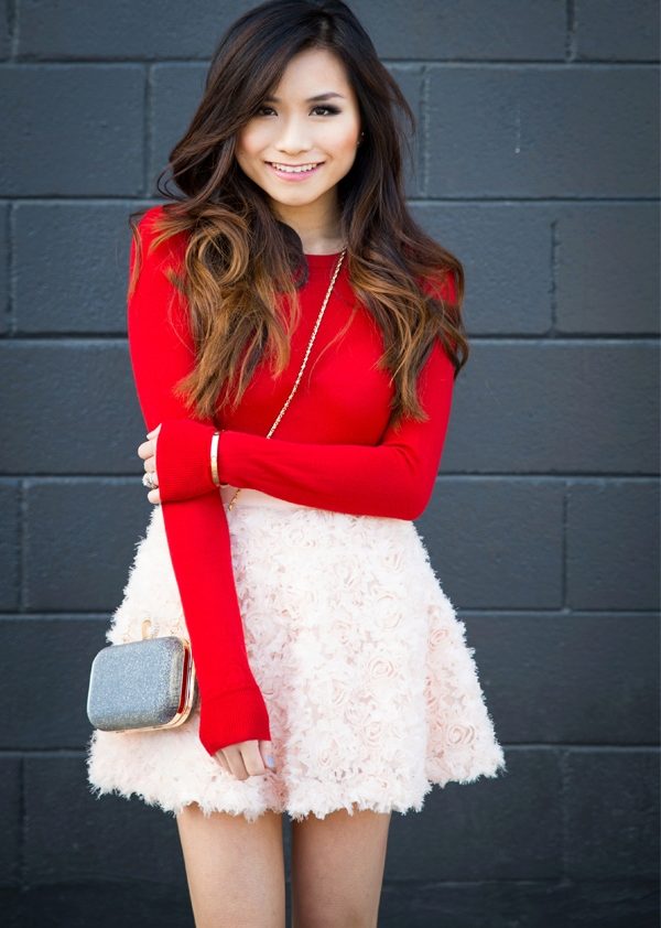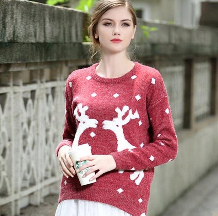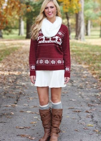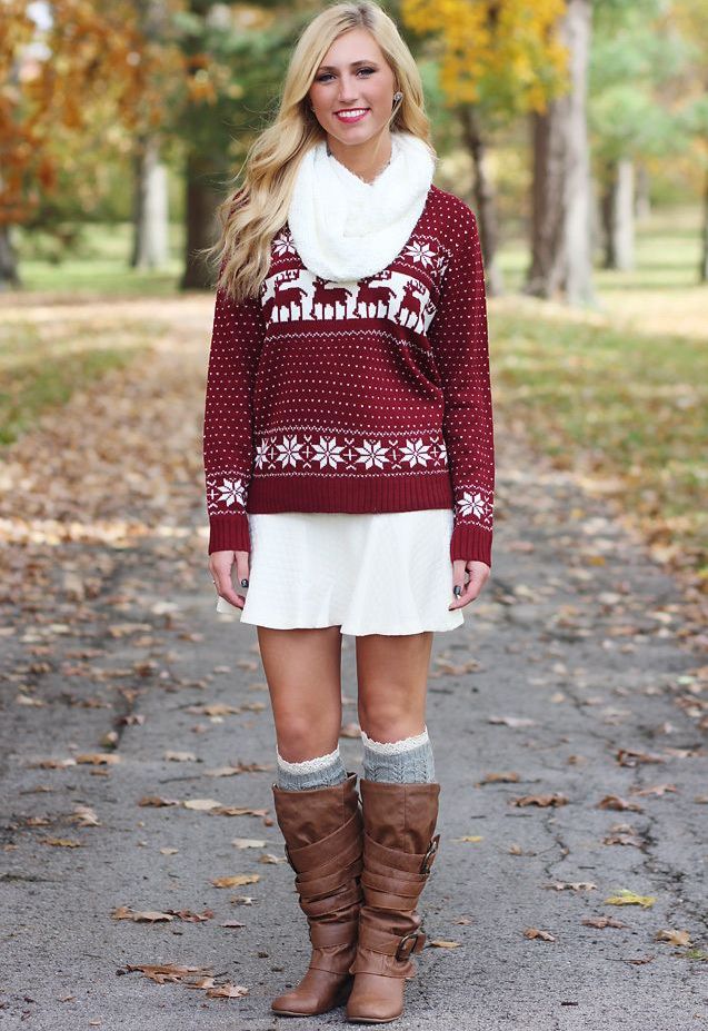 To create a romantic bow, you can wear a red sweater with white deers, and when choosing a bottom you should prefer a midi skirt with a wide belt.
