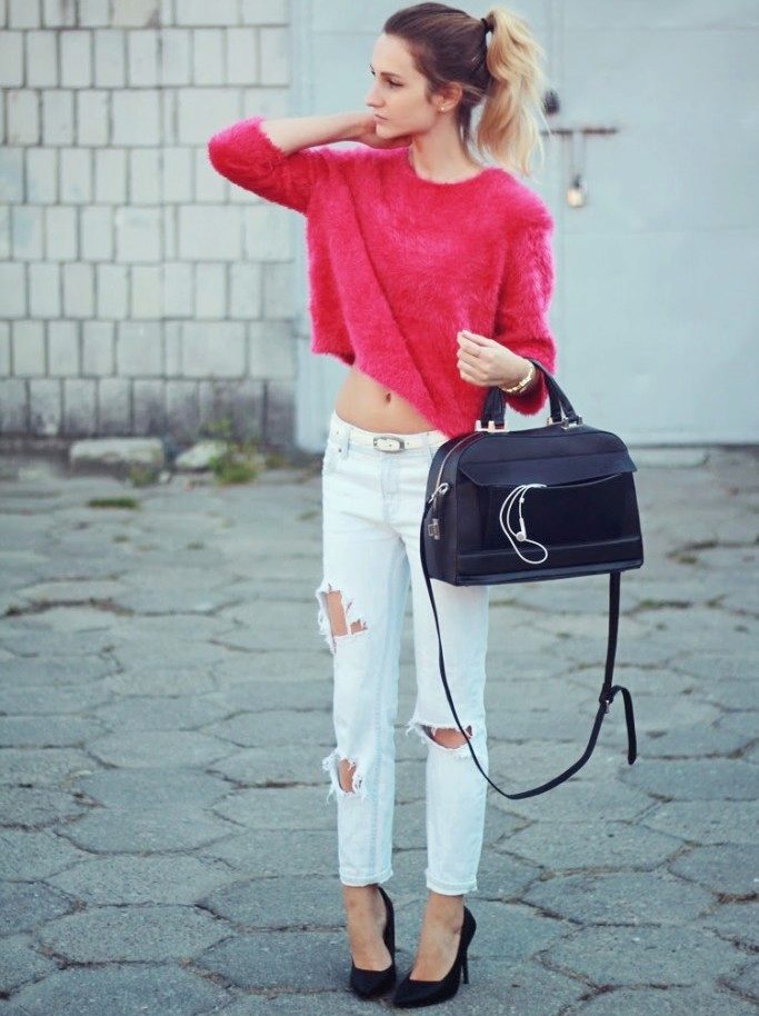 A red cropped sweater can be worn in tandem with leggings or short-length trousers. This combination will draw attention to the merits of the figure.