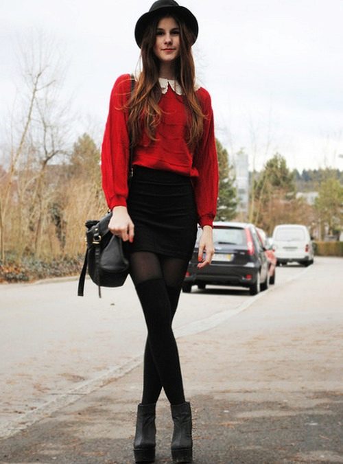 The original bow will surely attract men's attention if you wear a red sweater over a black combination dress. Boots with high tops and a cream-colored clutch bag will be a worthy addition to the sexy image.
