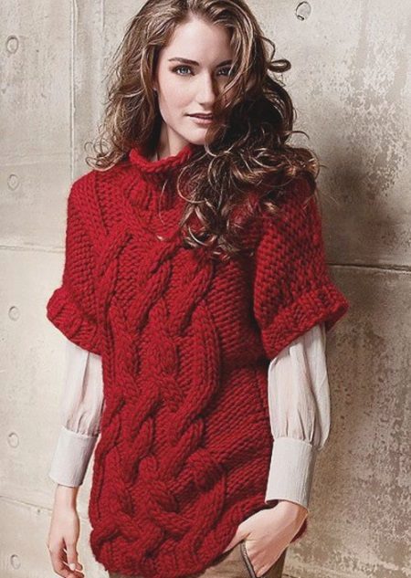 Today in trend knitted patterns in red. Coarse-knit models with short sleeves are in great demand. Many women of fashion prefer sweaters of free fit in oversized style. With such a model, skinny jeans or slim-fit pants will harmoniously look.
