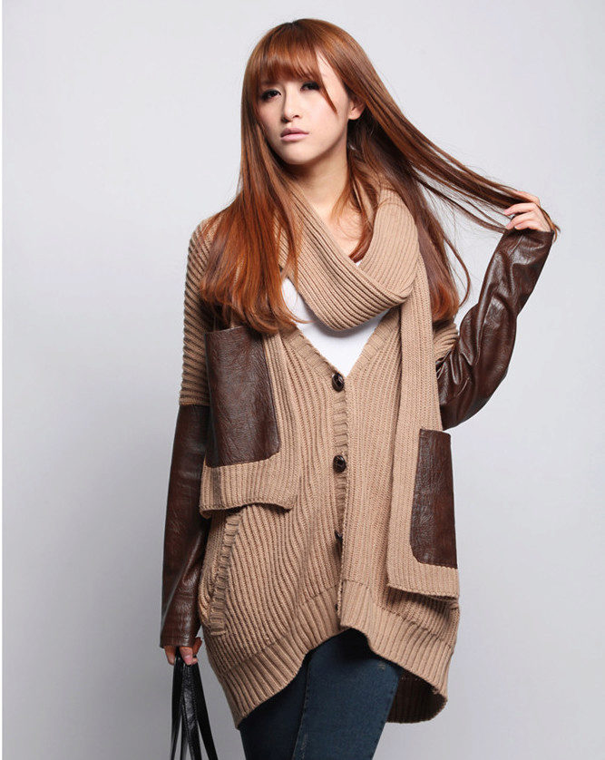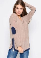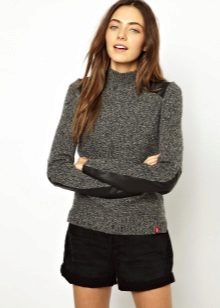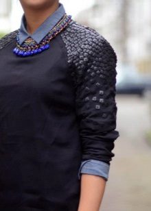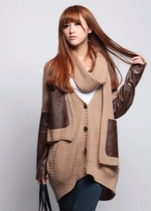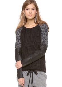 For example, sweaters with leather inserts in the elbows, so-called patches, or leather pockets, as well as with solid leather sleeves a couple of tones darker than the knitted part of the sweater, look amazing.