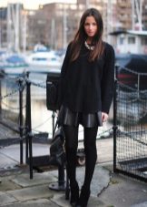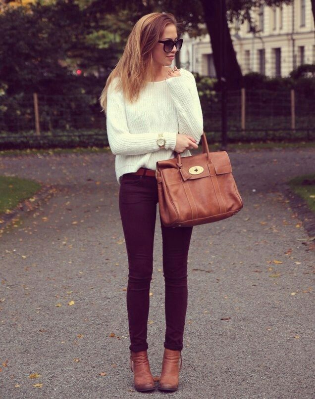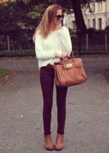 Of course, in the autumn, you can not do without the black tight tights, brown ankle boots and a stylish bag with a shoulder strap.