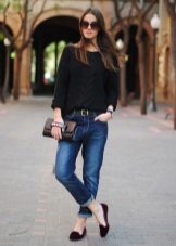 Stylish autumn bow can be created to pick up tight black jeans, a classic light-blue cotton shirt and black short boots with a flat sole.