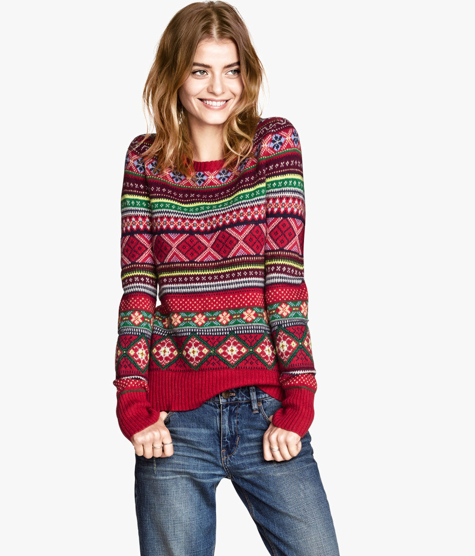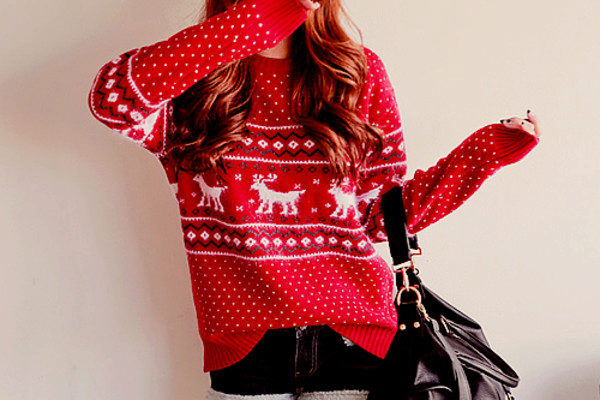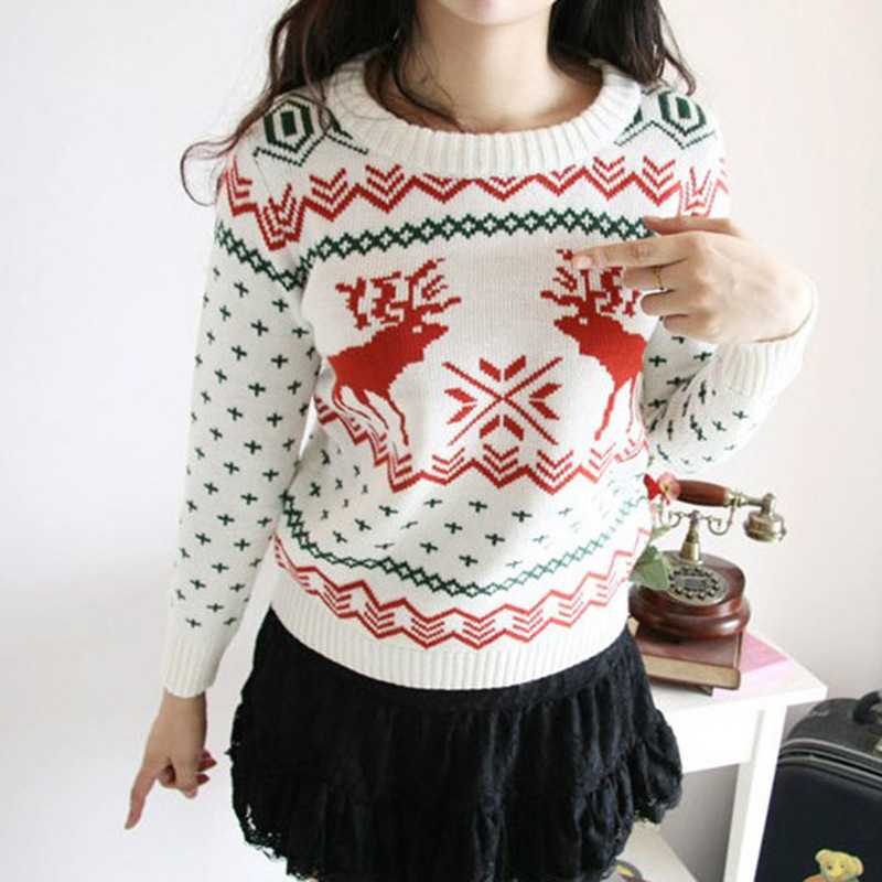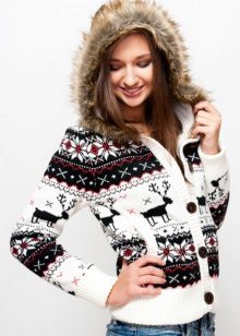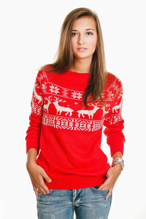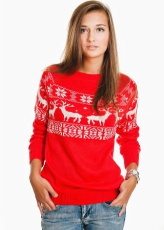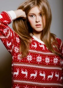 Sweaters with snowflakes and deer are most often represented in noble dark green and burgundy shades, combined with refreshing white color.