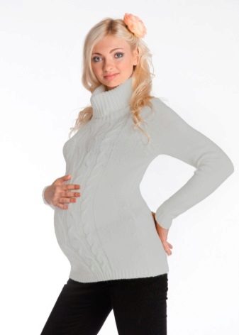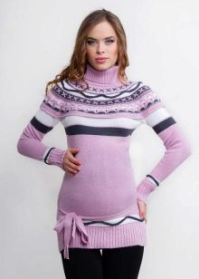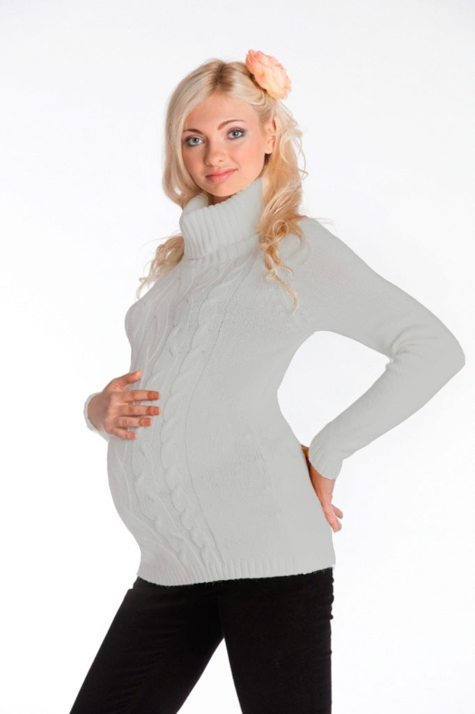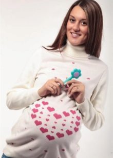 Models of sweaters for pregnant women can either have a free cut that hides the tummy, and can be tight, with a special convex area for the abdomen. Very often, sweaters for future mothers have very cute decorative elements in the form of bows, beads and beautiful embroidery, as well as various prints, which speak about the interesting position of a girl.