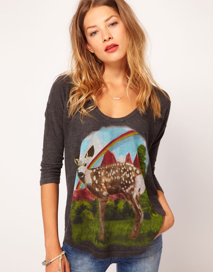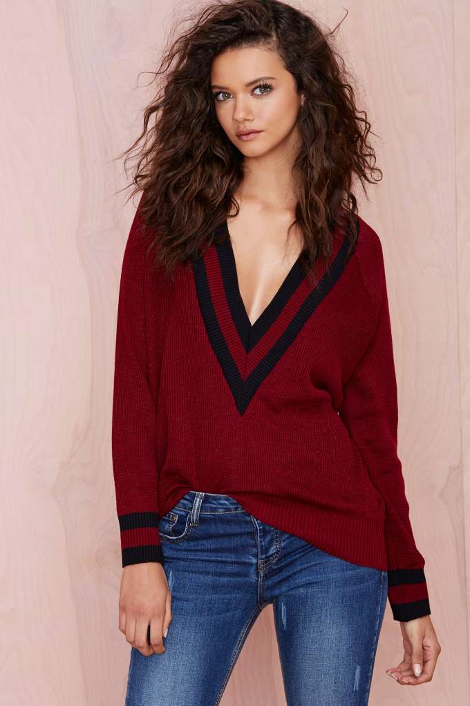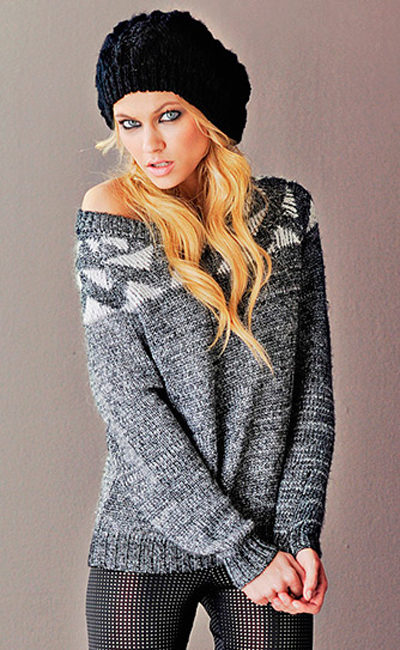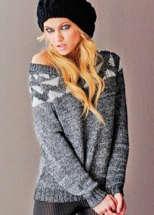 Youth models of sweaters often have a bright, unusual decor.For example, in the form of various thematic prints. In addition, models of asymmetrical cut, large knitting, as well as popular models of lalo are popular among young people.
