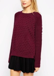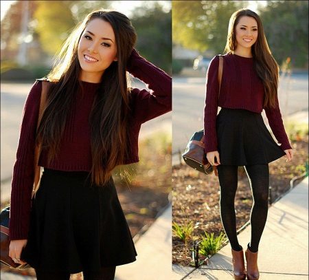 A stylish sexy look will come out with a combination of black skirt cut half-sun and burgundy cropped sweater.