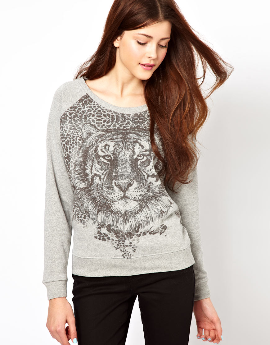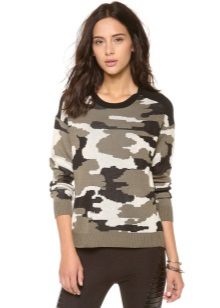 Camouflage print and khaki coloring are in demand among hiking and sports sweaters, and a print with a tiger is performed on a dark background of the product.
