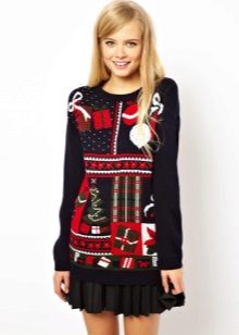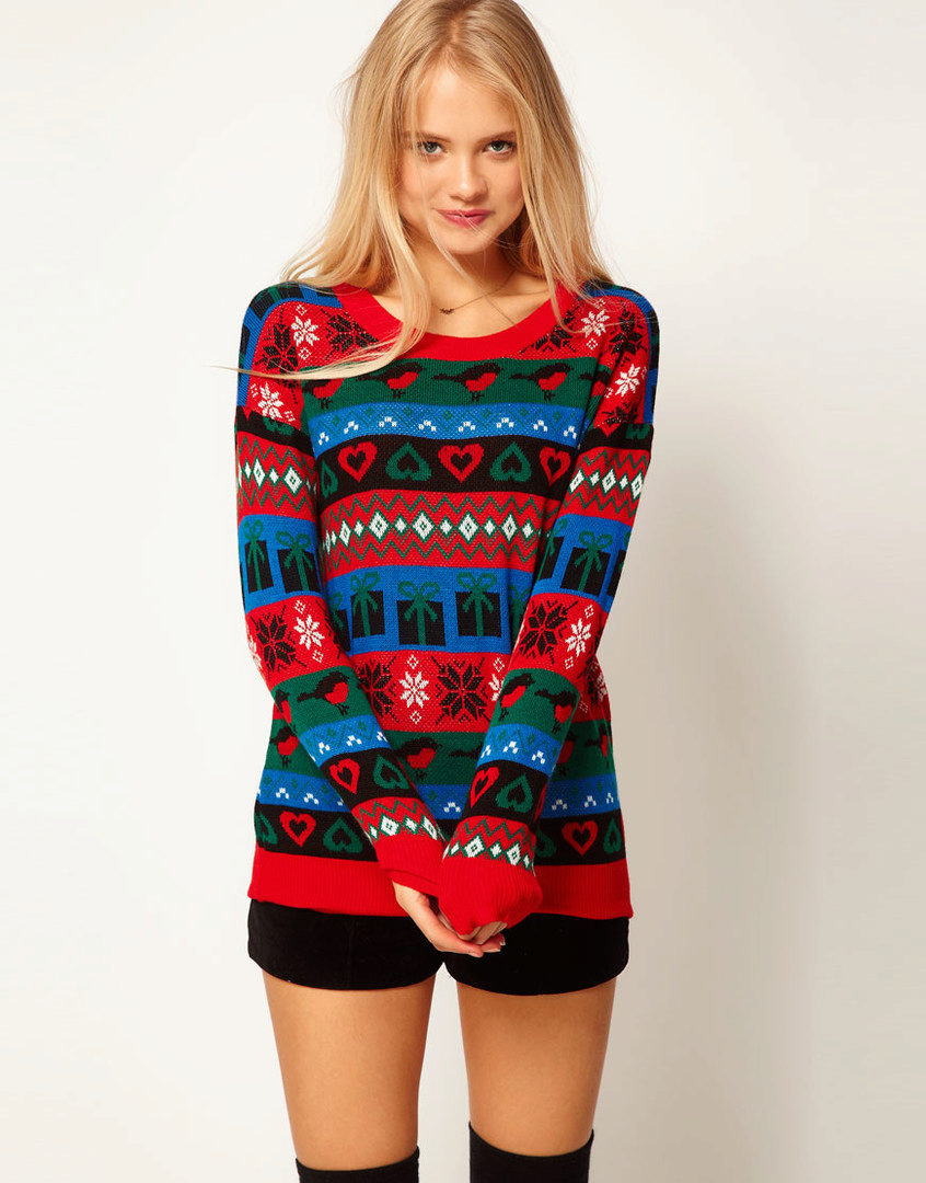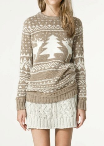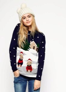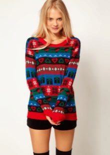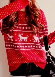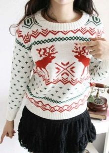 Christmas sweaters are most often made in red, white, green shades, and also have a characteristic print in the form of snowflakes and deer, and an asymmetrical sweater looks quite unusual and stylish, thanks to a slanting bottom.