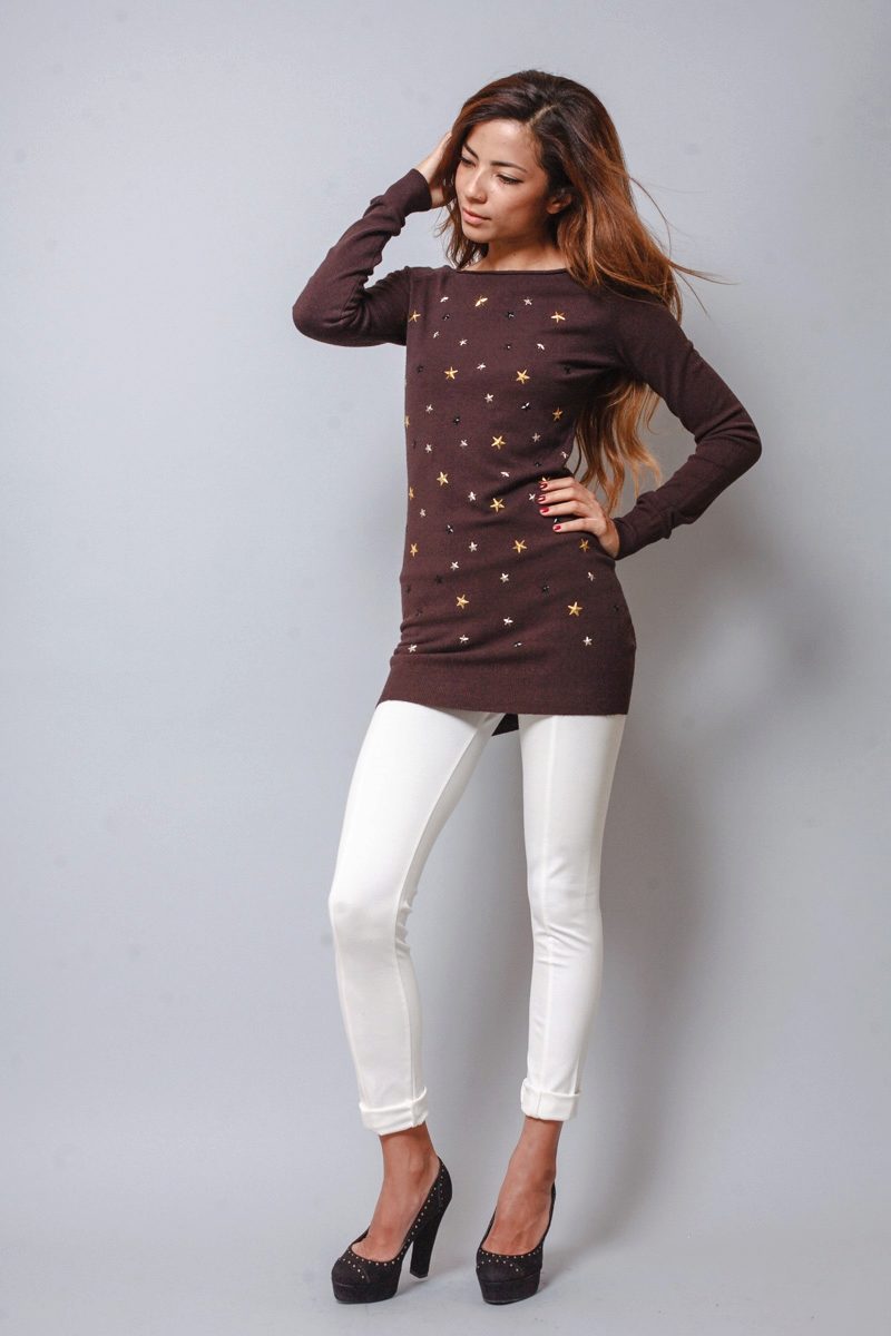 Sweaters with various decorations are also a success, be it embroidery, lurex, sequins, beads, fringe, flounces of various sizes, decorative buttons and unusual fabric inserts.