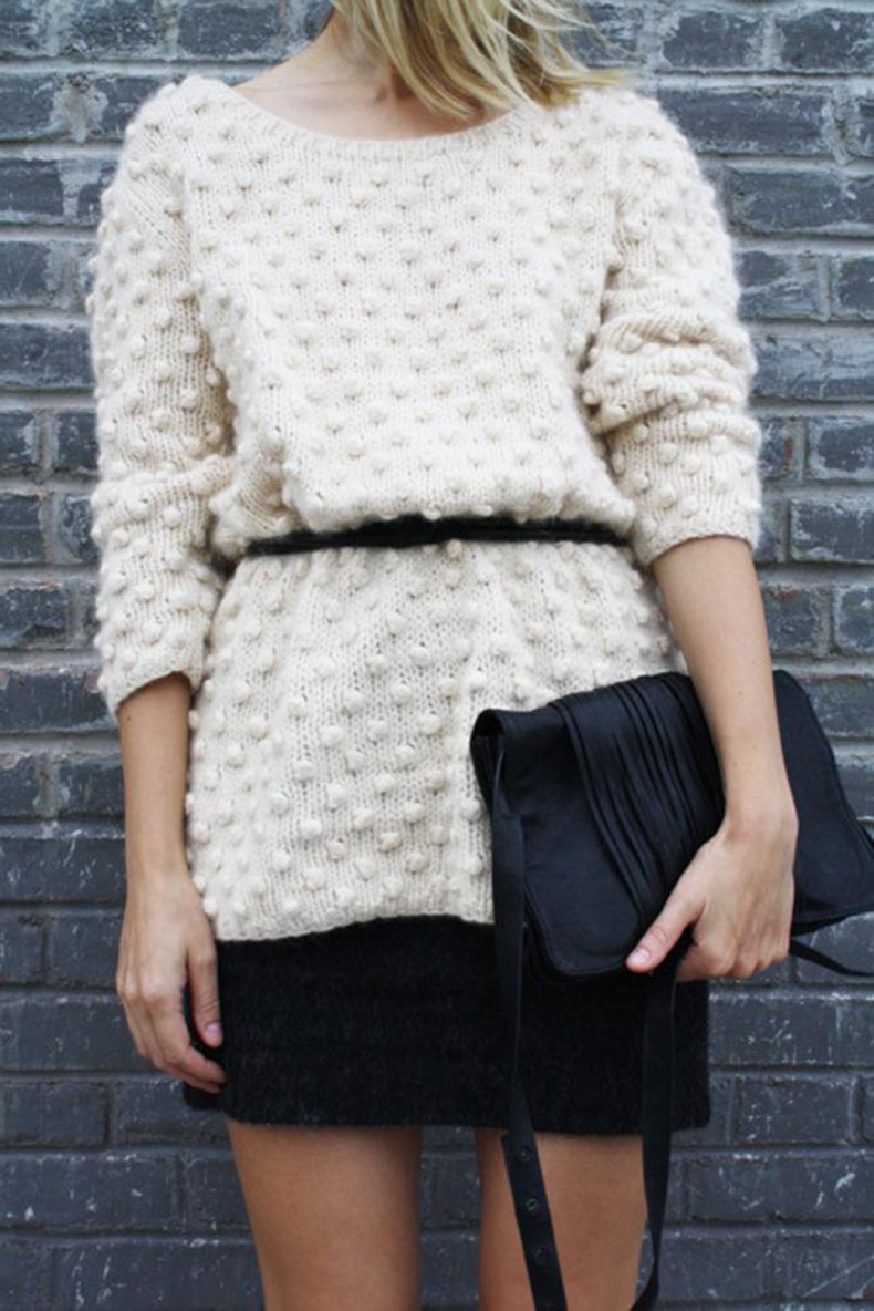 In addition, sweaters can have various ornaments, as well as a jacquard pattern, most typical of Christmas patterns. Due to the special style of knitting on the sweater, small bumps of thread can be made, as well as a special pearl pattern that looks interesting, but a little rough.