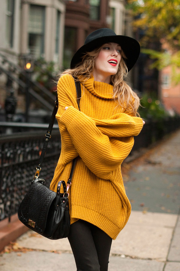 The fitting dress perfectly harmonizes with the loose style of the sweater, and in addition with the stylish mustard ankle boots on the platform and the bag to match the shoes, the look will be interesting and unusual.