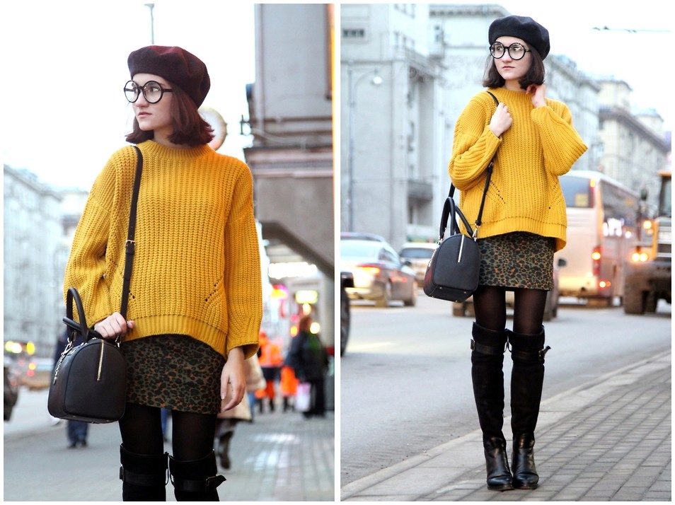 A free cut mustard sweater will go perfectly with a leopard mini skirt in dark colors.Dark pantyhose, high leather boots with heels and a small bag - the red velvet are perfect for this set, helping to create a conservative style.