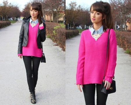 A loose pink sweater will become an unusual bright spot, and a leather jacket of a leather jacket and a large golden necklace will be an excellent addition to this leather jacket.