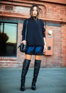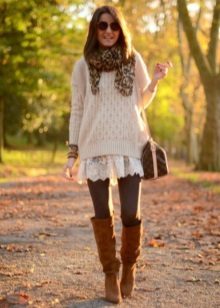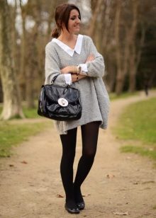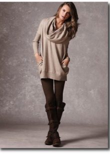 Sweater tunic is suitable for walking, shopping and meeting with friends. Tight tights will make your legs visually slimmer, and comfortable ankle boots will not let you get tired. From jewelry you can choose a massive pendant and elegant earrings.