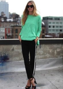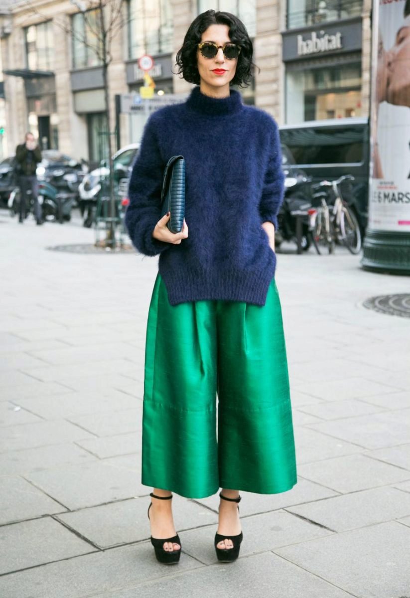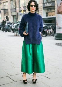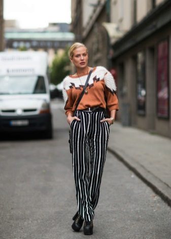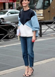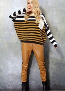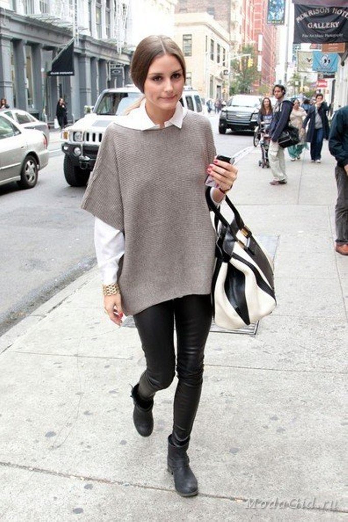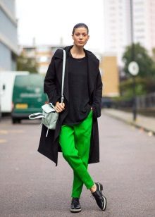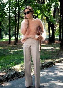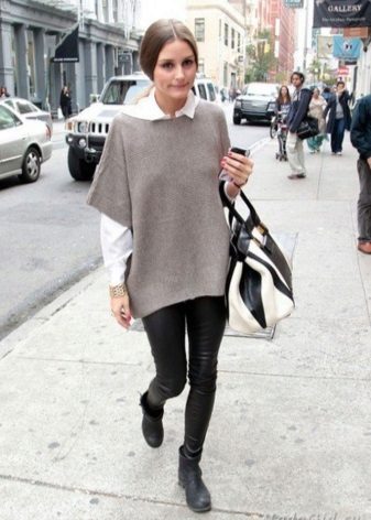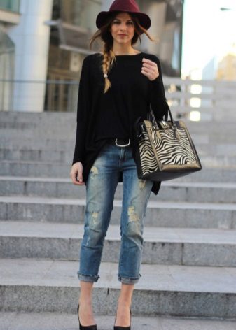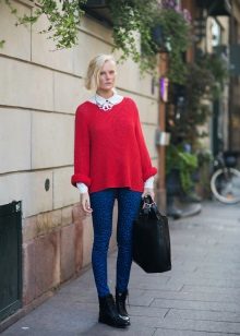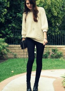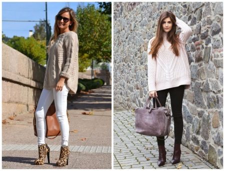 The most popular option is skinny jeans. A tight bottom will most advantageously emphasize an unusually bulky top. Looks stylish with high-heeled shoes or flat shoes.