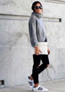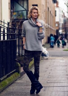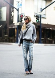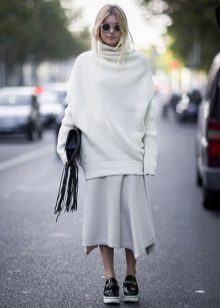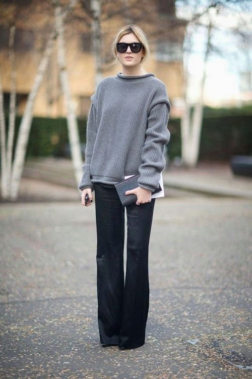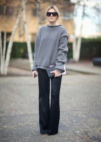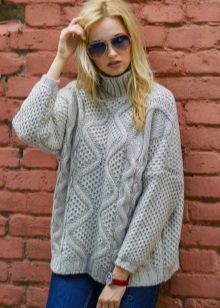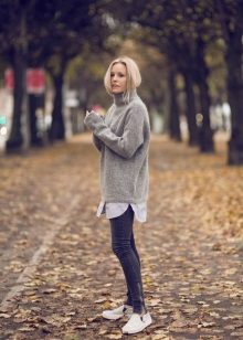 The color palette of sweaters in the oversize style is not limited to anything. However, it does not do without leaders. Gray is the shade that is at the top of the most fashionable trends. And sweaters of this shade is no exception.