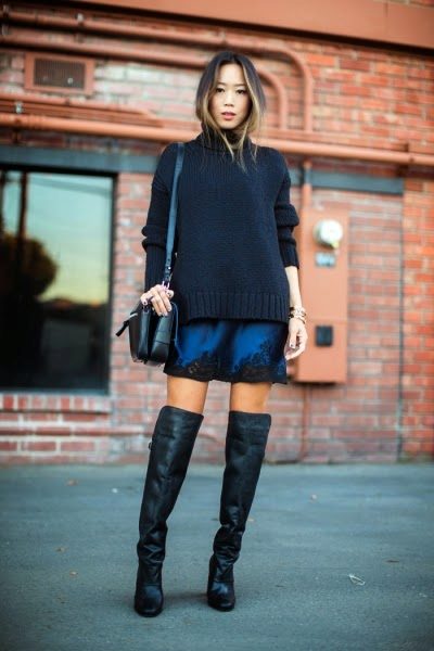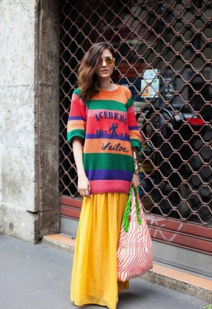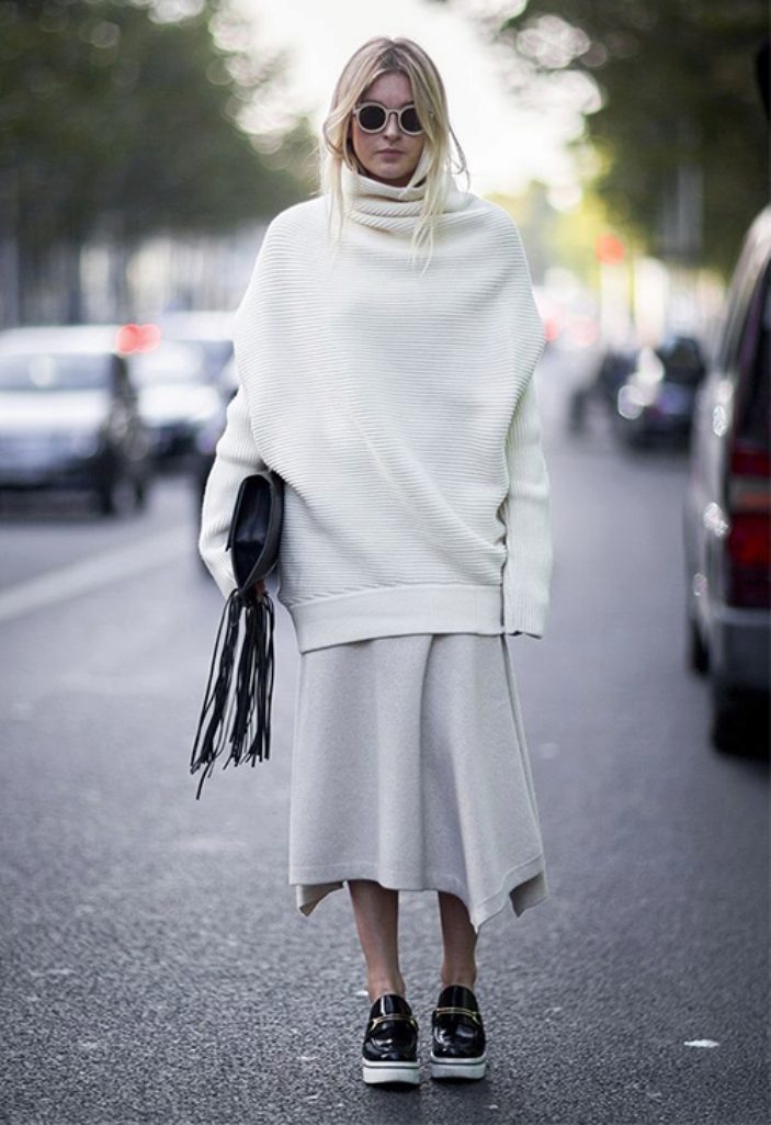 Maxi skirt is a wardrobe item that can create an elegant look. By adding an oversize sweater to it, it turns out a trendy and chic bow.
