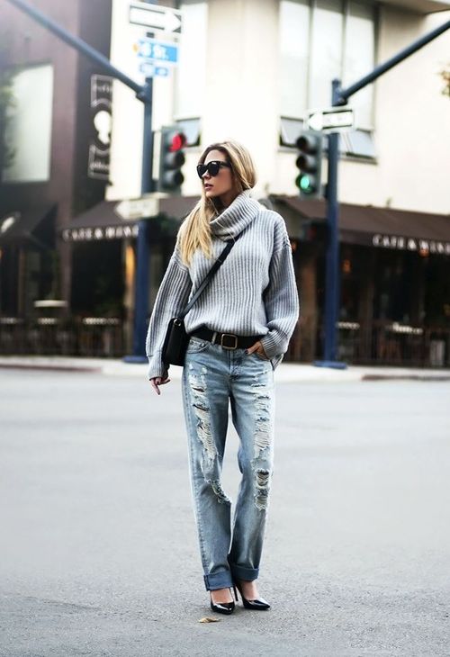 Overseas with boyfriend jeans will suit tall and thin girls. This super volume kit looks perfect with sneakers or stilettos.