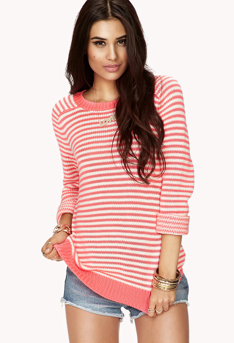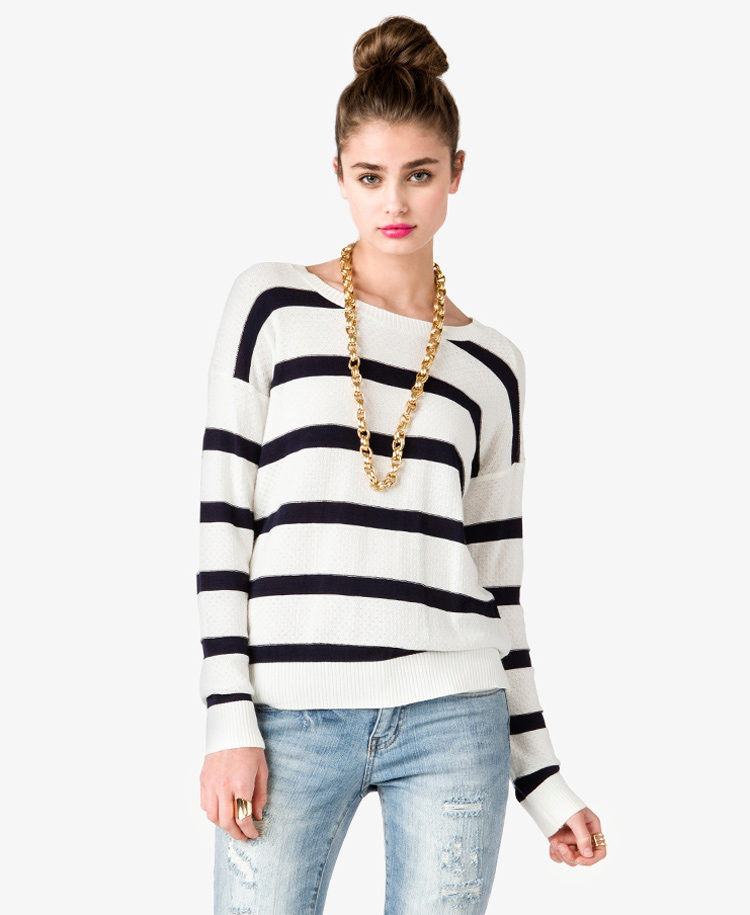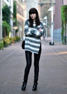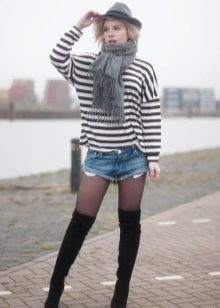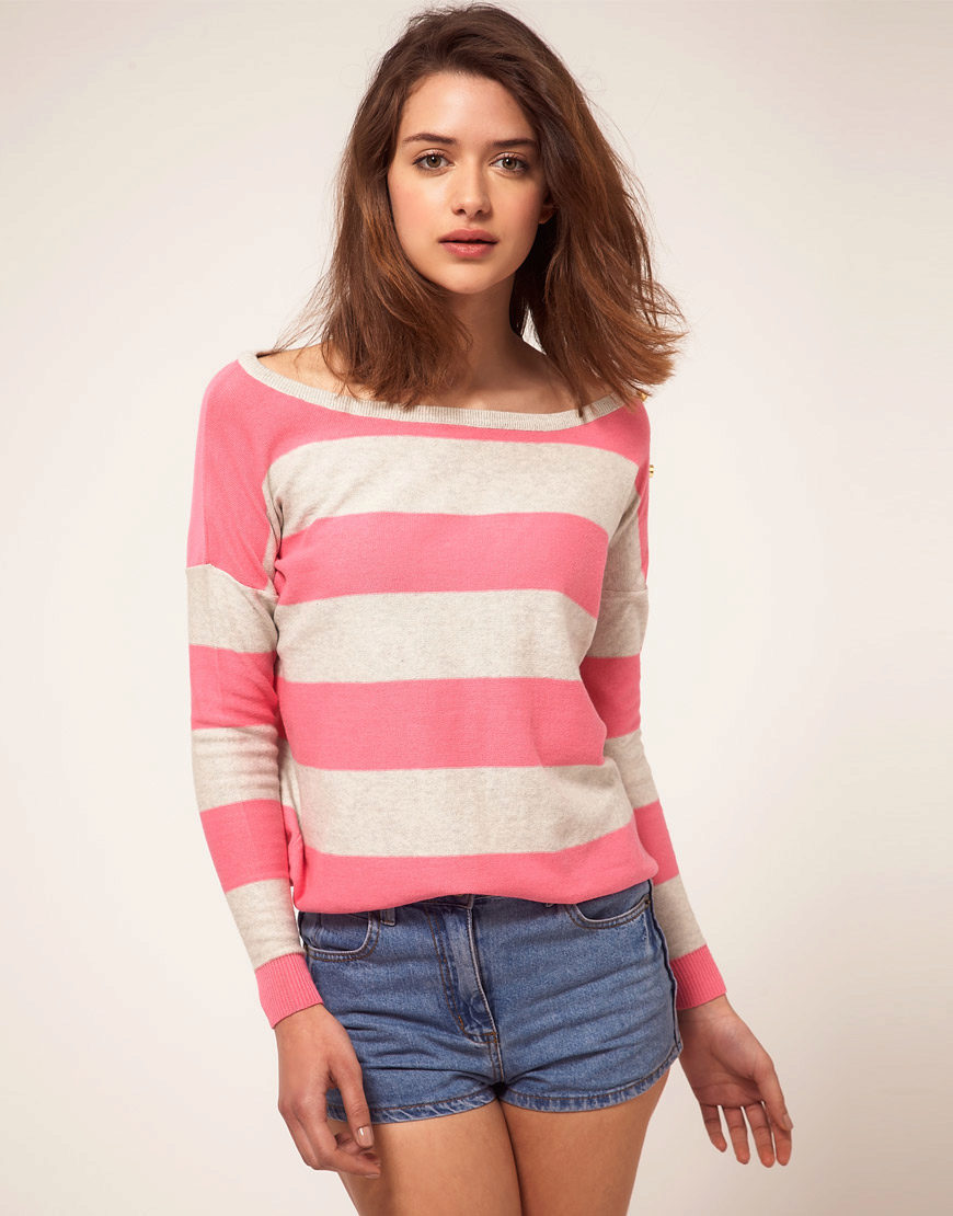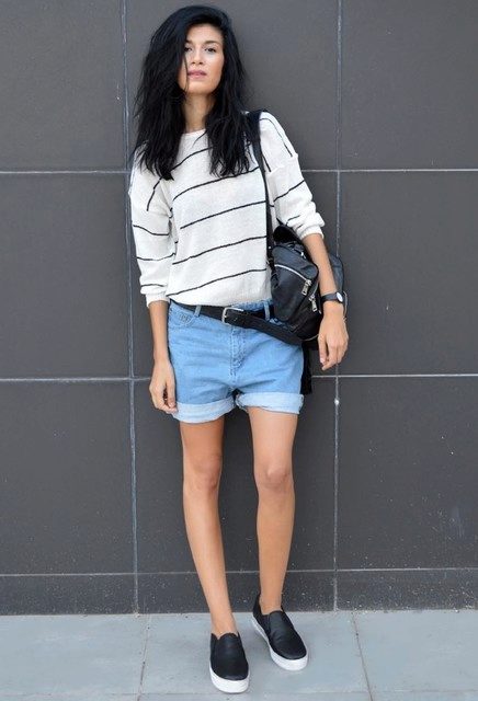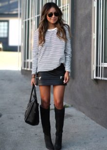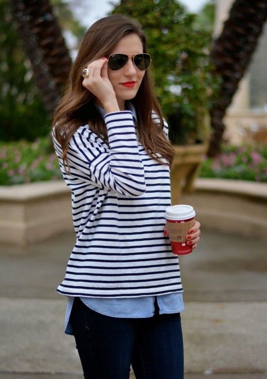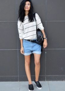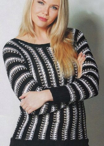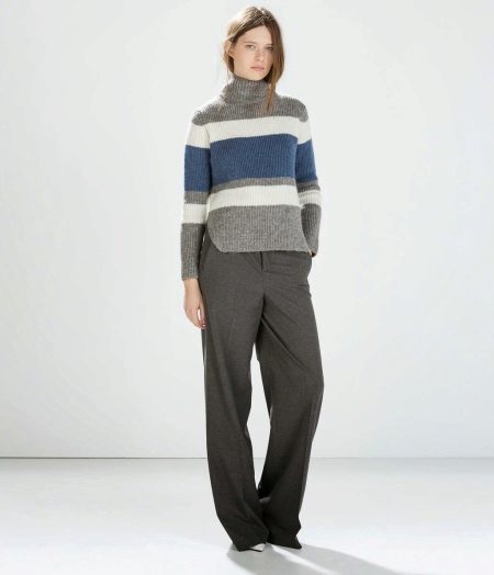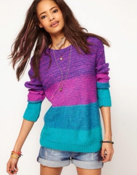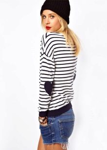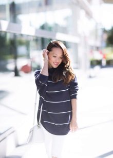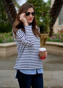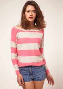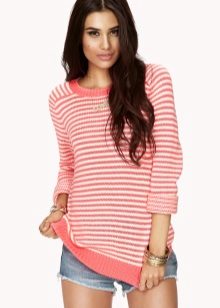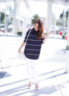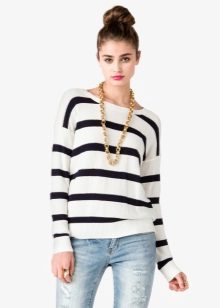 Striped sweaters are truly universal, because they can be made an attribute of both casual and business attire. It is best to combine them with pants, jeans, mini skirt and pencil skirt or shorts. Jacket can be worn over the sweater and pullover. The best part is that the image can be completed with any kind of shoes, starting with shoes, ending with high-heeled shoes.