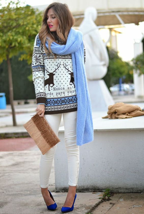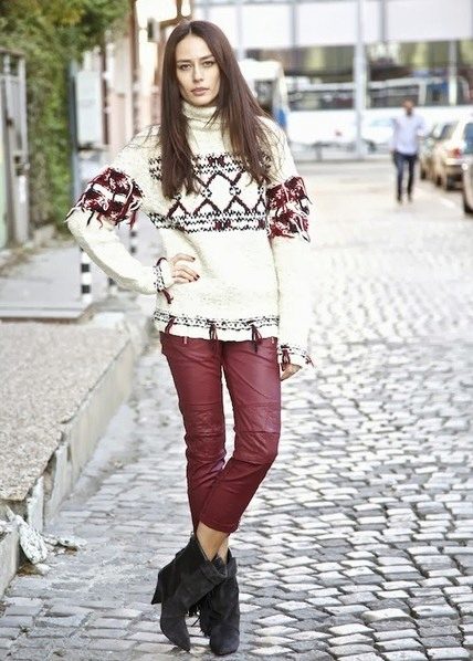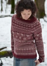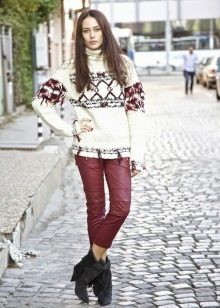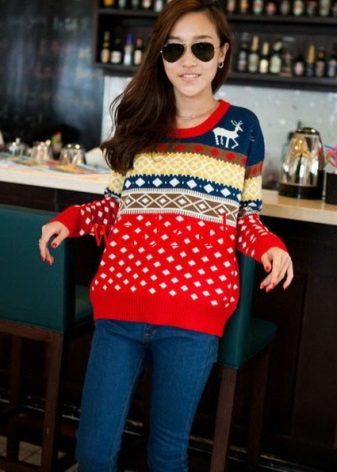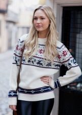 It should be remembered that the ornament itself, even made in neutral colors, is a bright detail. Therefore, the sweater must be the most active thing in the ensemble. It should not be combined with clothing with colorful prints.otherwise it will turn out too alyapisto.