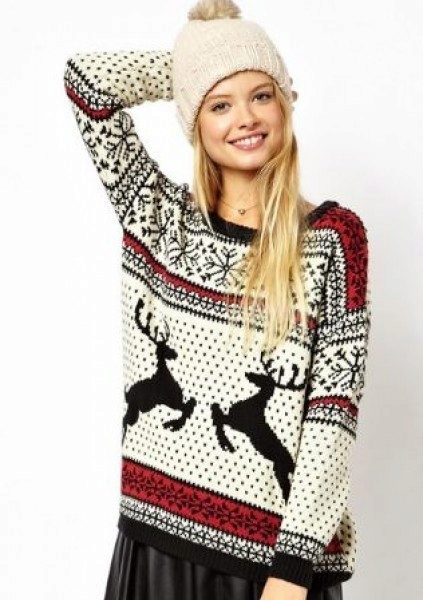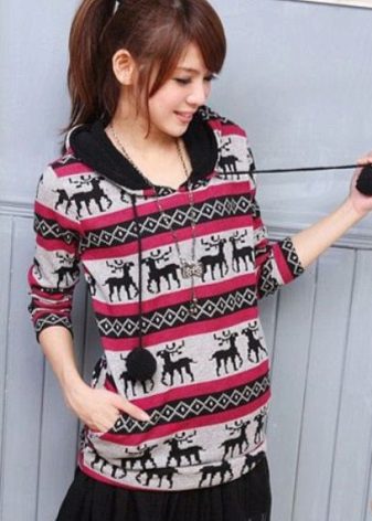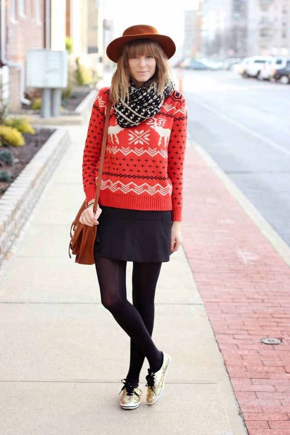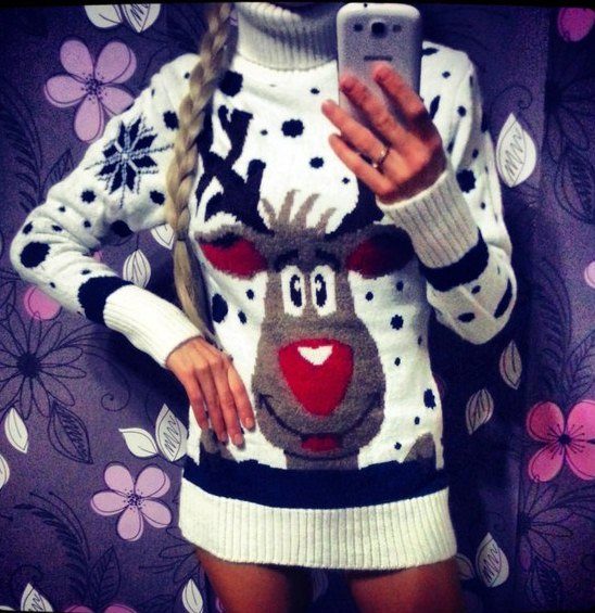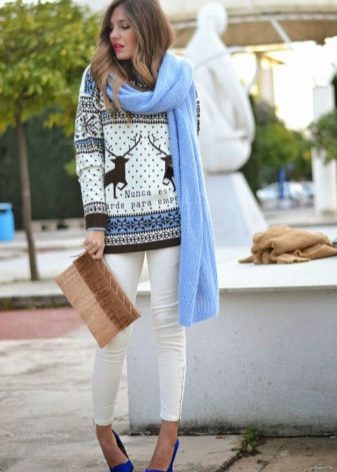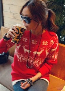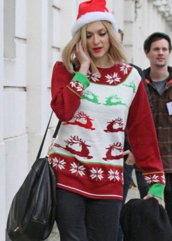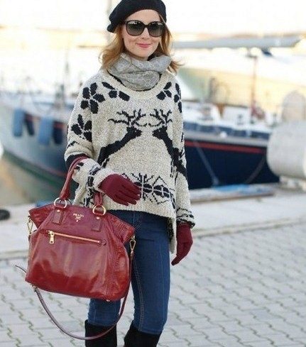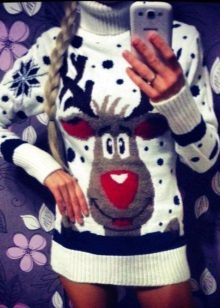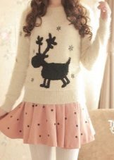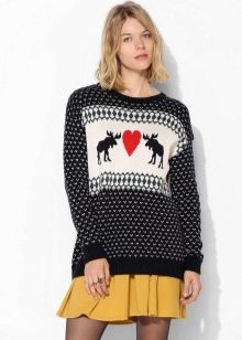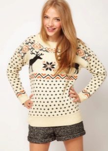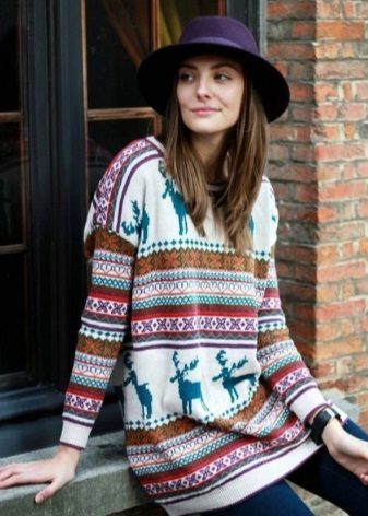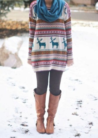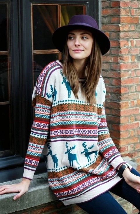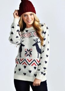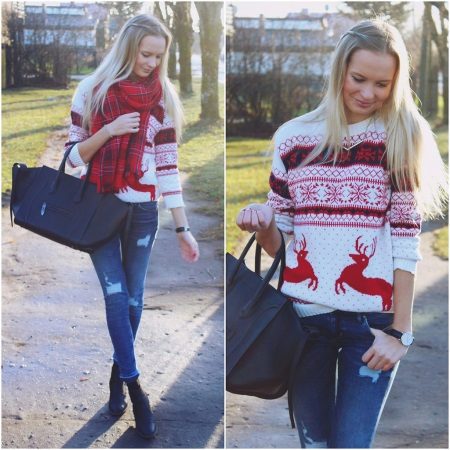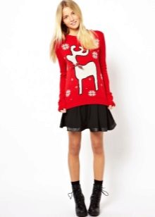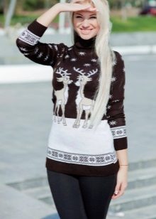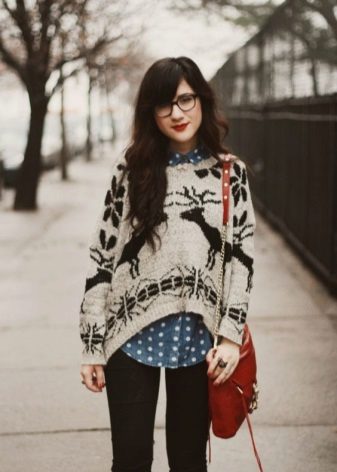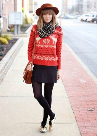 Lovers of skirts and shorts do not despair. A sweater with deer will look great with these things. A practical image will combine comfortable shoes and tights, so as not to freeze the legs. To make your look special, pick up a hat and scarf, and you will seem to be a passer-by girl, just come off the cover of a magazine about style and fashion.