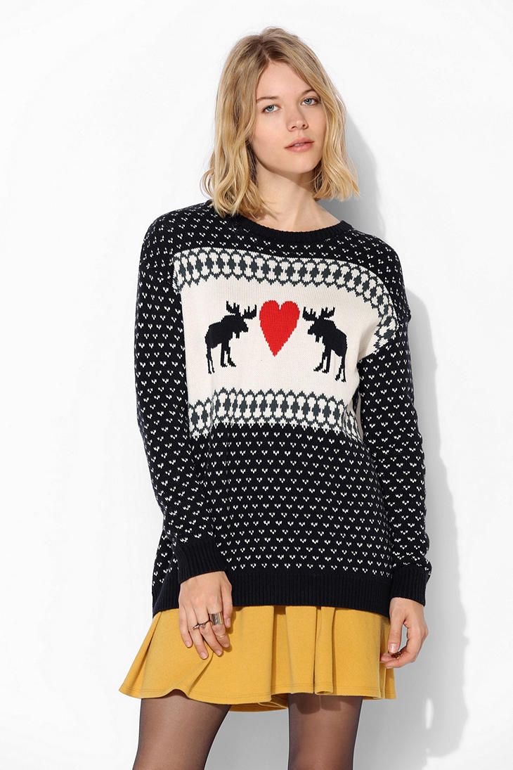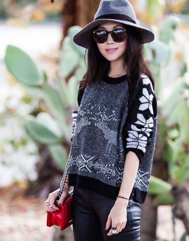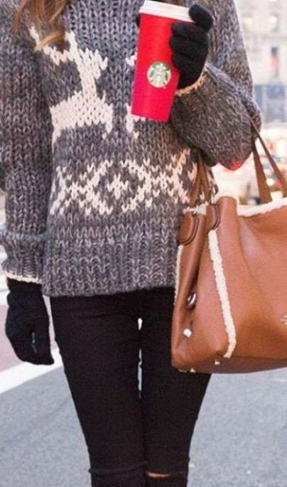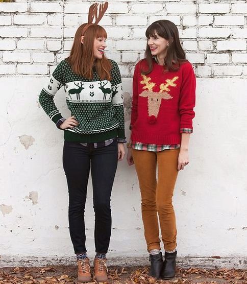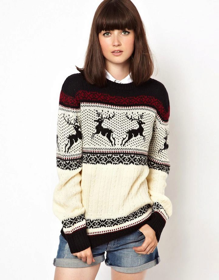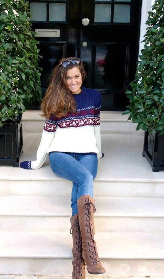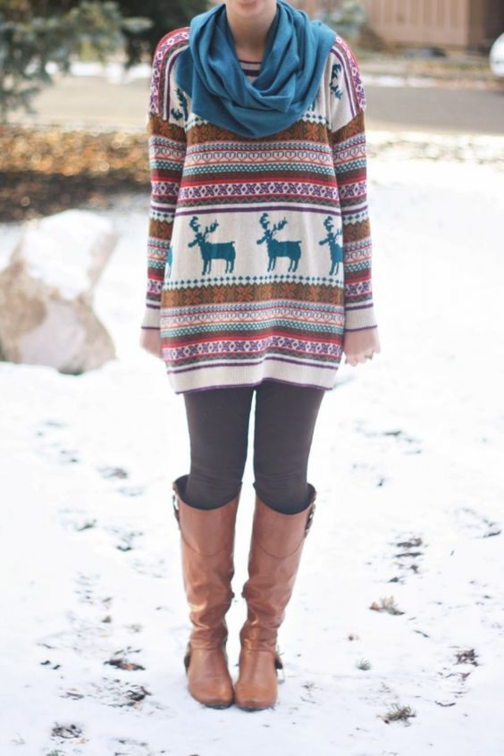 Lovers of skirts and shorts do not despair. A sweater with deer will look great with these things. A practical image will combine comfortable shoes and tights, so as not to freeze the legs. To make your look special, pick up a hat and scarf, and you will seem to be a passer-by girl, just come off the cover of a magazine about style and fashion.