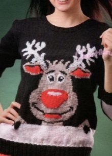 A special place among them is occupied by holiday models. They are always bright and colorful, with one kind remind of the upcoming Christmas. In the drawings of Christmas products, in addition to deer, there are snowflakes and snowmen, garlands, Christmas trees. Often a sweater is decorated with voluminous elements, for example, the red deer Rudolph is made with a red fleecy nose.
